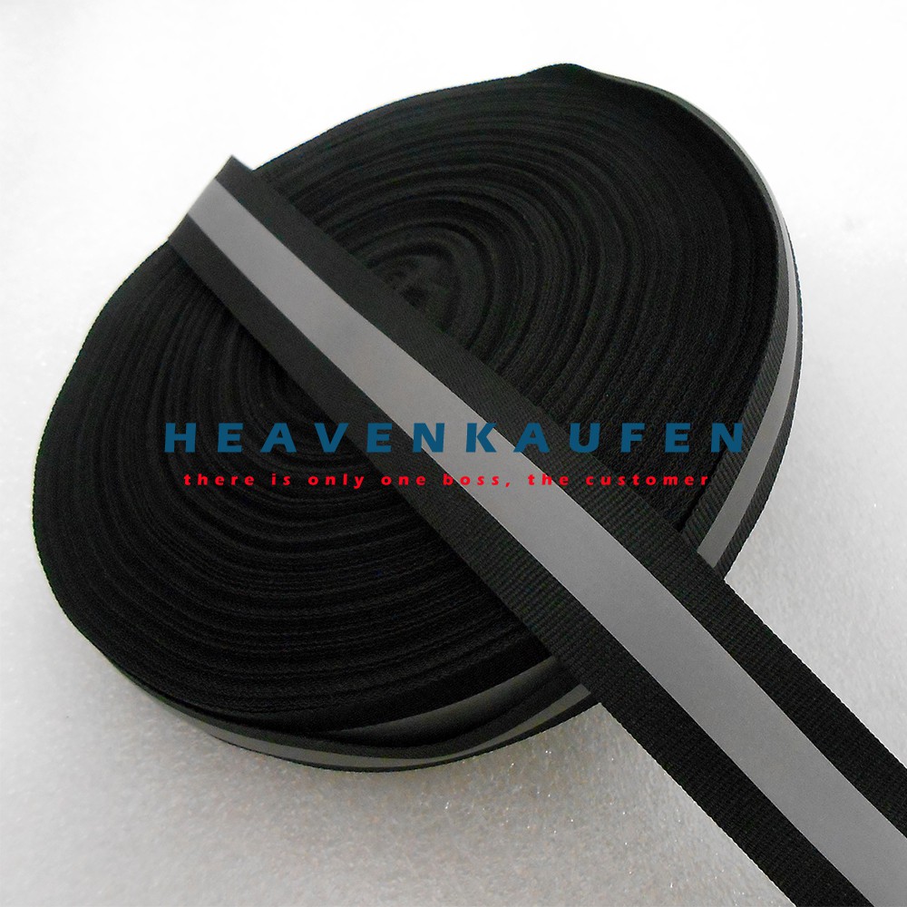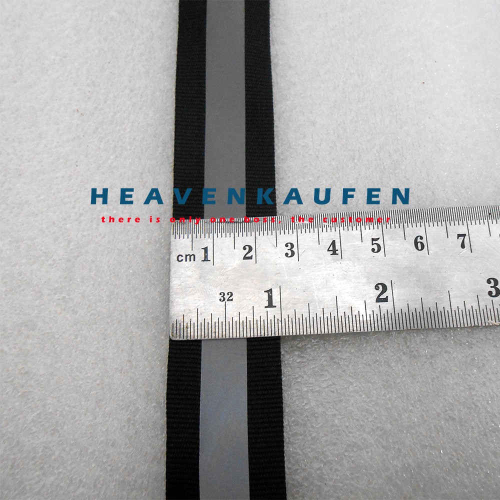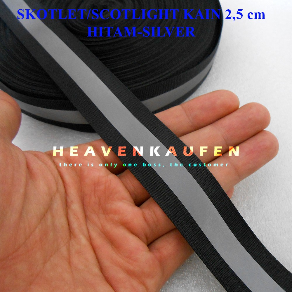 Pita Skotlet Lebar 2,5 cm Meteran Hitam-Silver Kain Jaket lis kombinasi strip webbing baju rompi safety Scotlite Scotlight Reflective 1" in inch inchi 25mm 2,5cm fosfor tape reflektor