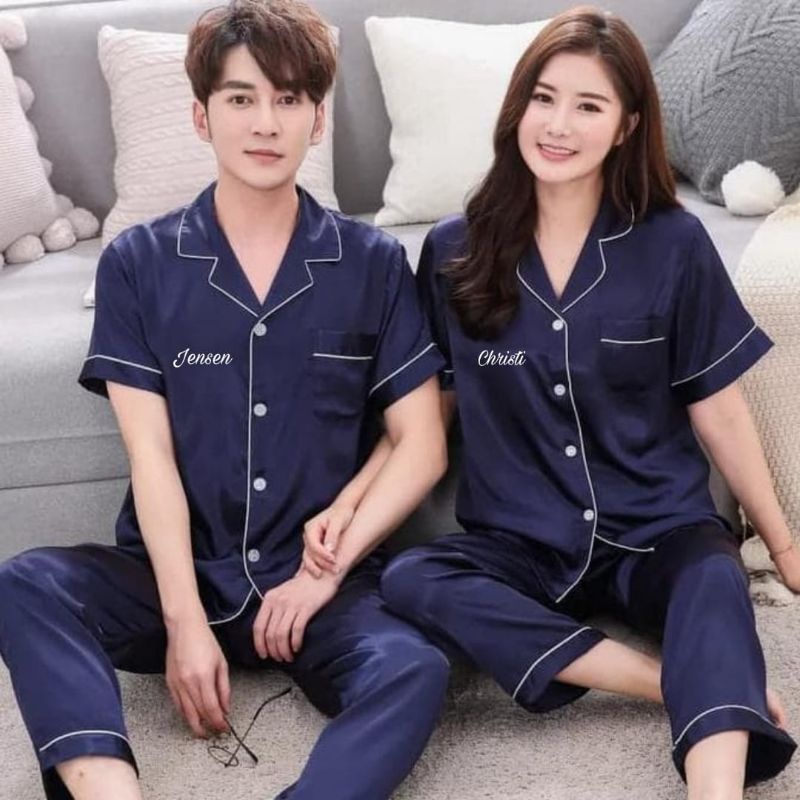 Piyama pajamas baju tidur satin couple PP / CP pria wanita custom bordir nama hadiah kado gift hampers nikahan wedding pernikahan prewedding / untuk seserahan murah unik lucu navy hitam merah maroon cewek cowok lengan pendek panjang celana