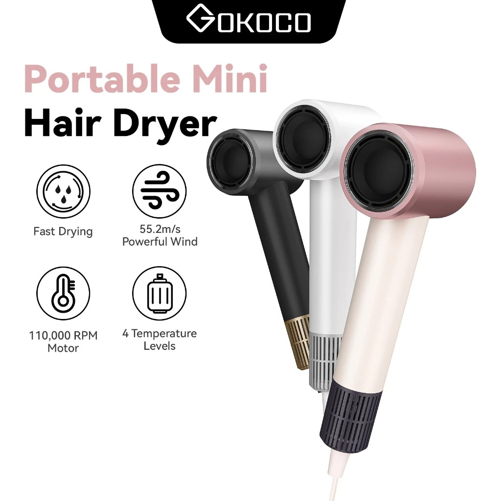 GOKOCO Mini Hair Dryer Ion Negatif 1,52 Miliar 110,000 RPM Portable dengan 4 Tingkat Panas dan Nozzle Magnetik untuk Pengeringan Cepat dan Styling Rapi