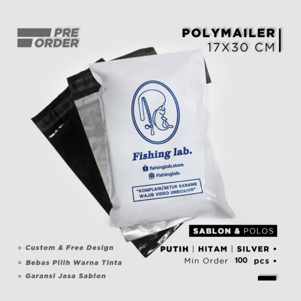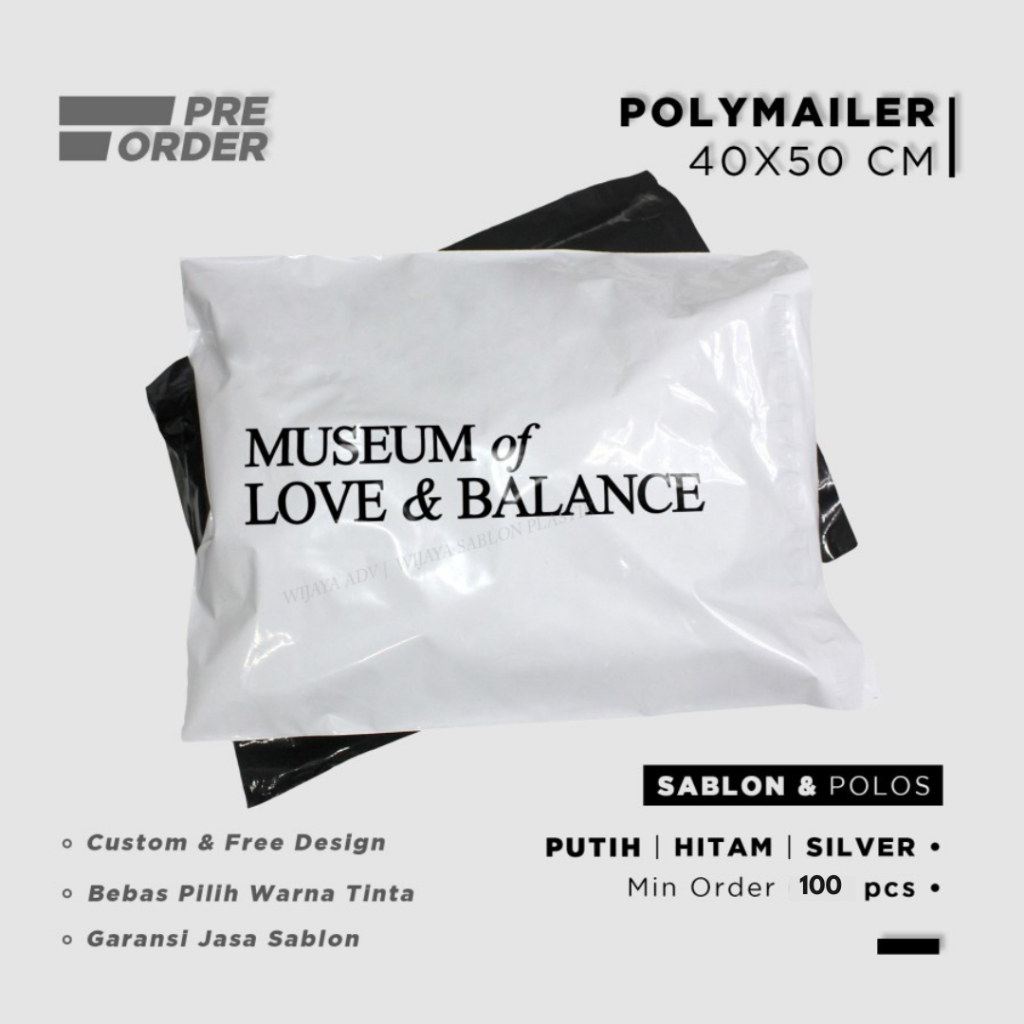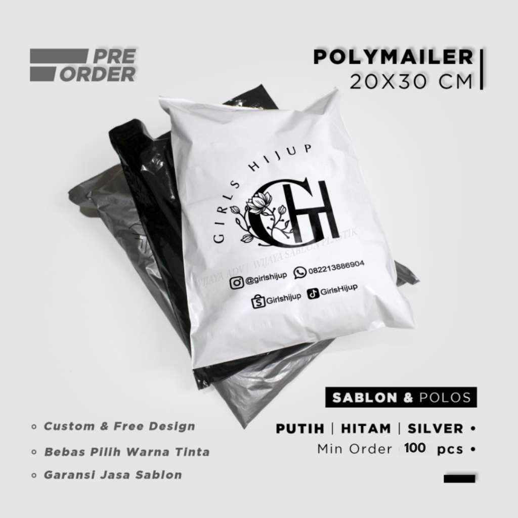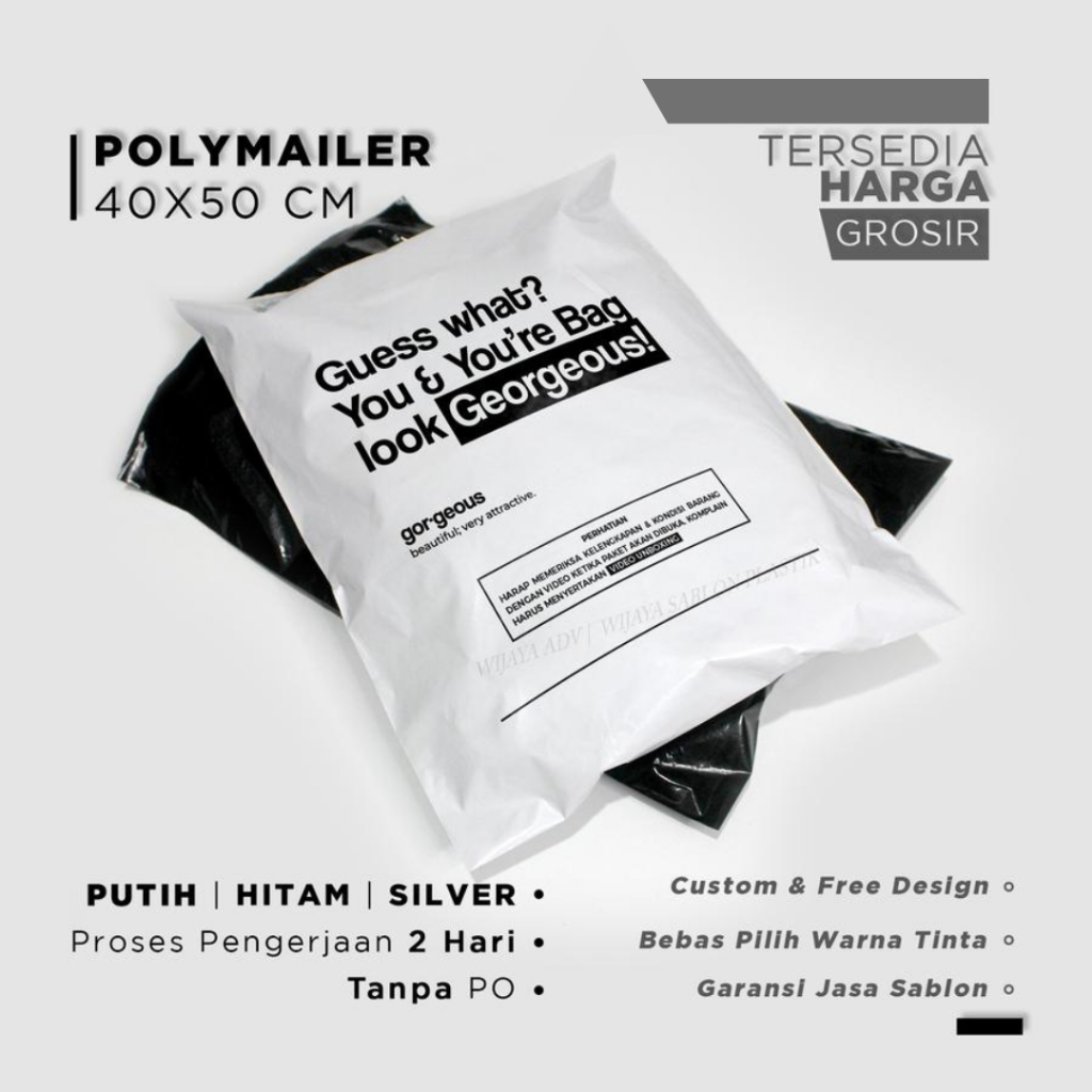 Plastik packing sablon custom free desain polymailer pembungkus paket brand warna hitam putih silver