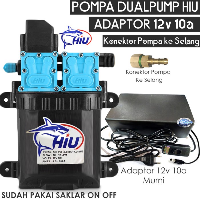 Pompa air DC Hiu Dualpump + Adaptor 12V 10A + Konektor pompa ke Selang