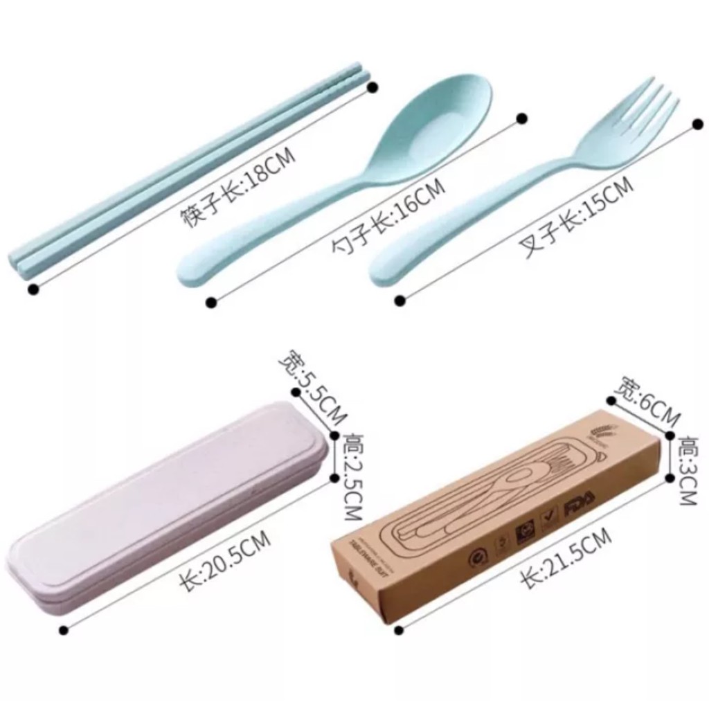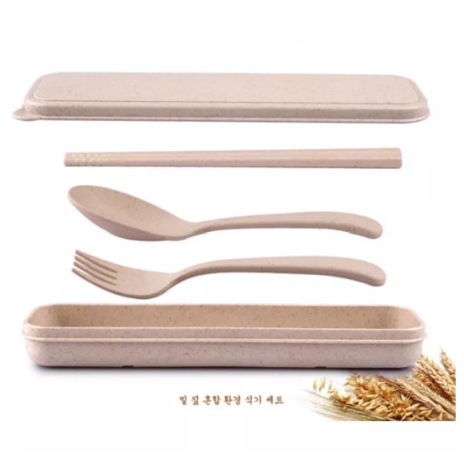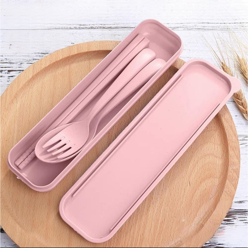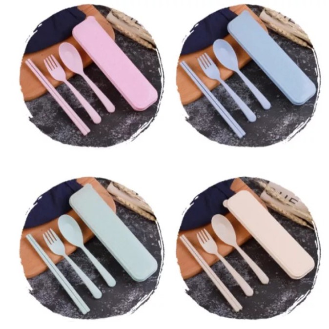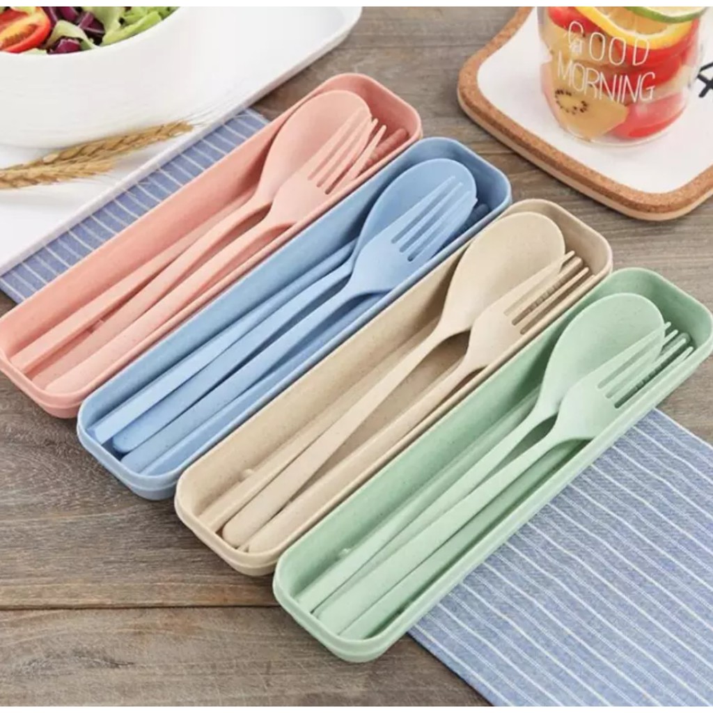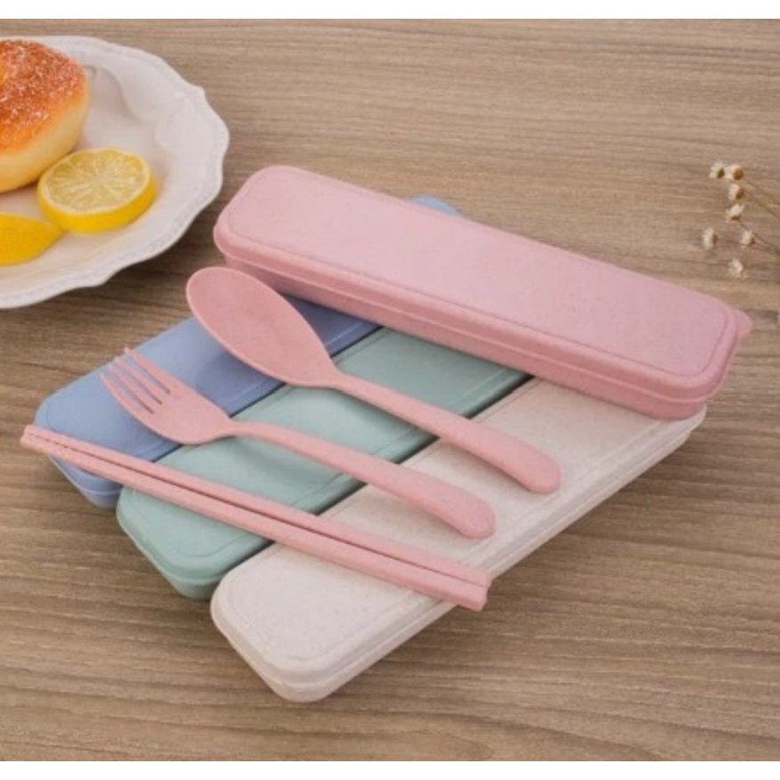 WBS Sendok Set Garpu Sumpit sendok Bahan Jerami + kotak Sendok Set 3 in 1 Perlengkapan Makan COD PR035