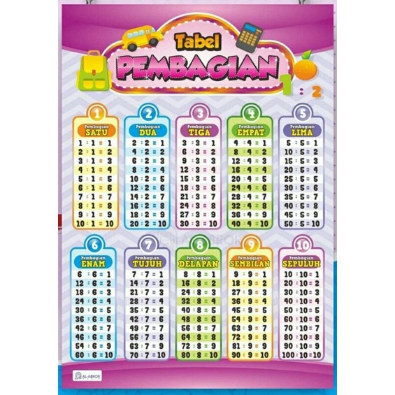 Poster Dinding Tabel Pembagian Matematika 1 sampai 10 Mainan Edukasi Anak TK PAUD SD MI Ivory A3+