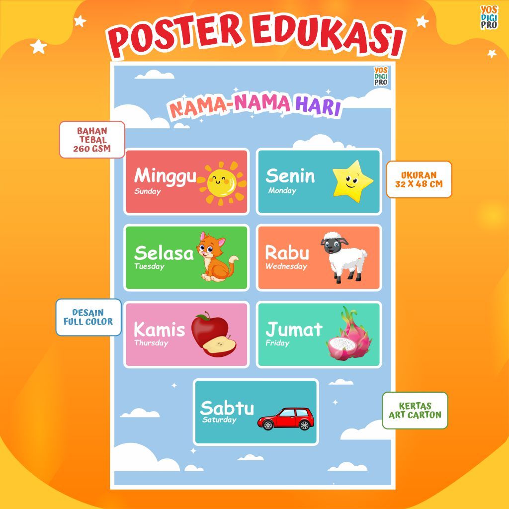 Poster Edukasi Anak Belajar Mengenal Nama-Nama Hari, Desain Menarik Full Color