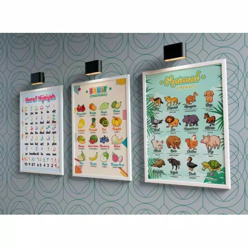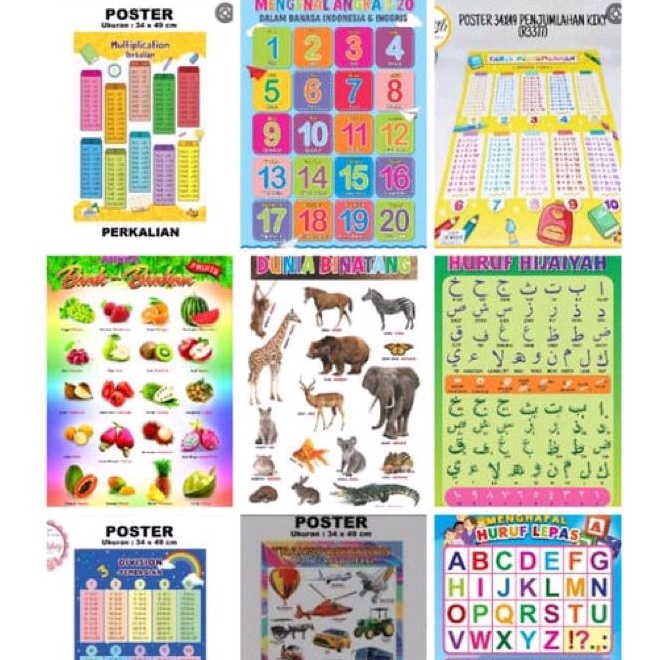 Poster Edukasi Anak belajar Angka, Huruf, Hewan, Transportasi, Hijaiyah, bilangan, (SATUAN)