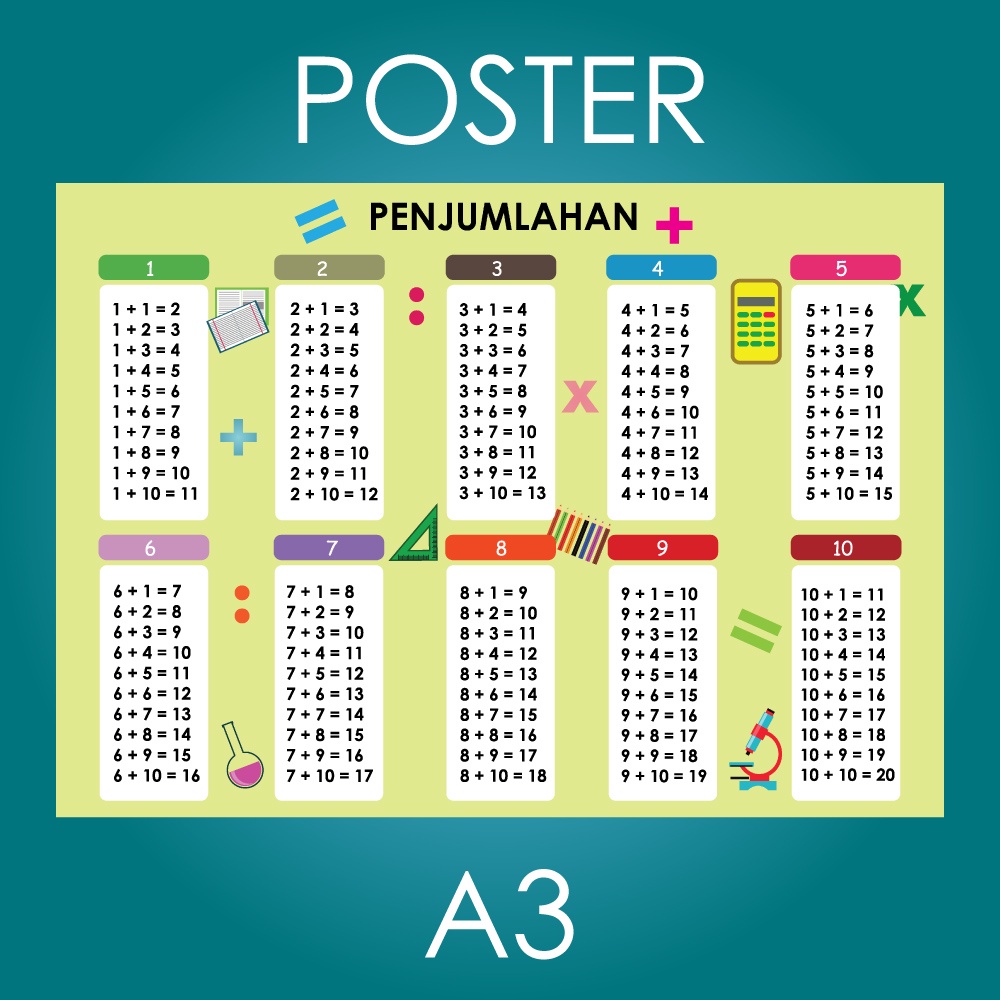 Poster Tabel Penjumlahan 1 sampai 10 - Ukuran A3