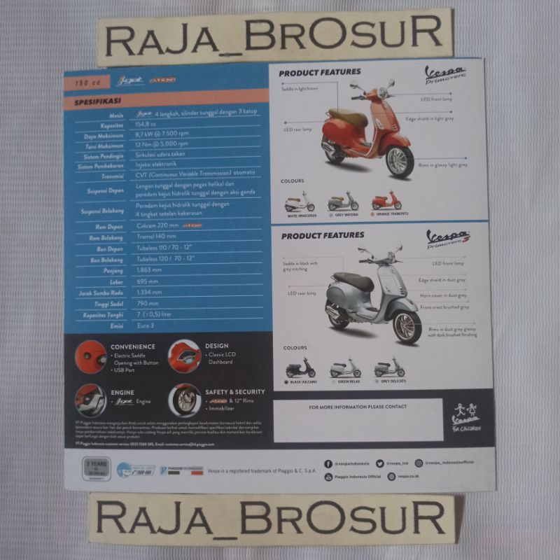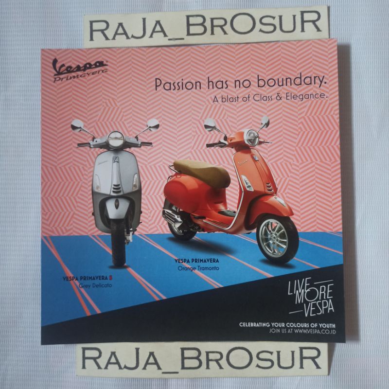 Poster brosur flyer Piaggio Vespa Primavera S Grey Delicato. Vespa Primavera Orange Tramonto