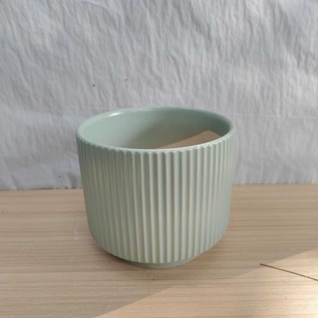 Pot Keramik Pot tanaman hias pot bunga model bulat motif garis-garis warna hijau