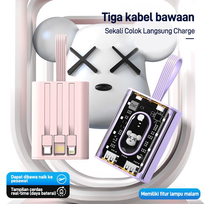 Power bank 25000mAh mini yang nyaman, power bank transparan berkapasitas besar, power bank 3 IN 1 25000mAh dengan tampilan lampu boneka kartun gaya punk, dilengkapi dengan pengisian cepat USB tiga kabel
