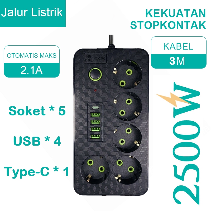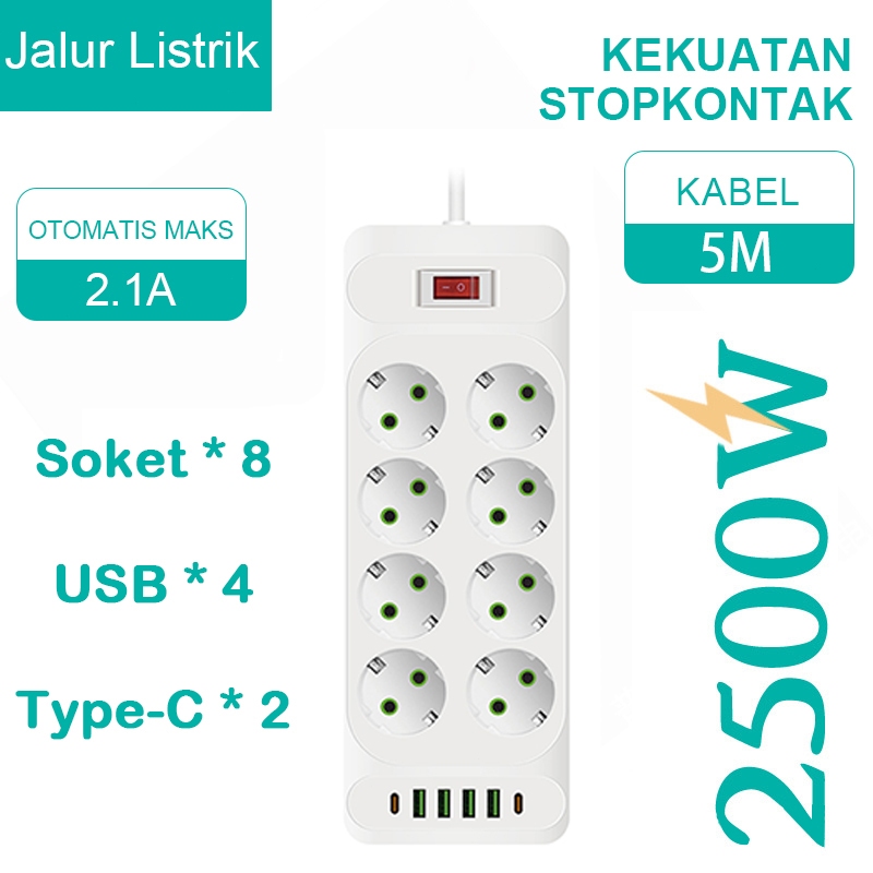 PowerPort 2500W Power Strip Power Socket Stop Kontak colokan usb stop kontak Colokan kabel Serbaguna Multiguna Panjang 2 Meter Power Socket Colokan listrik type c 4 Port USB 10 Port Stop Kontak 2* Type-C Port