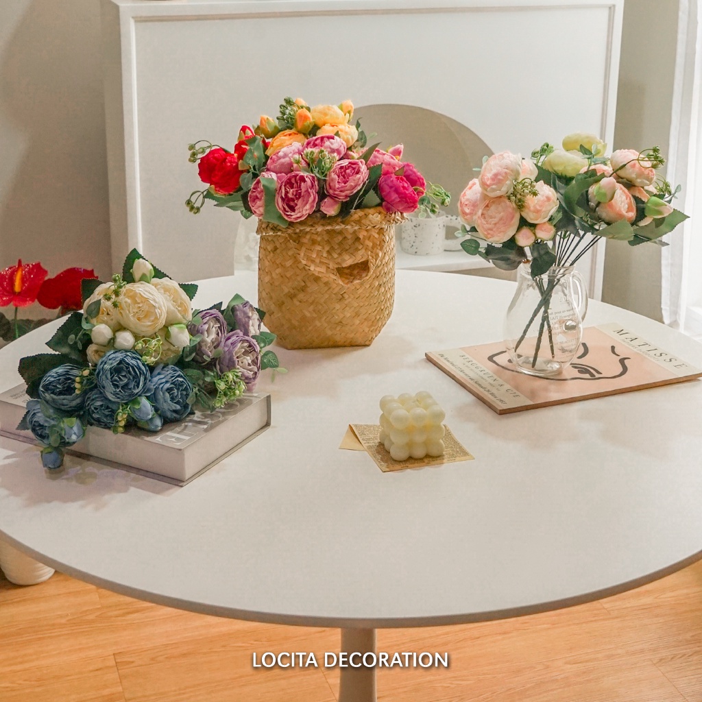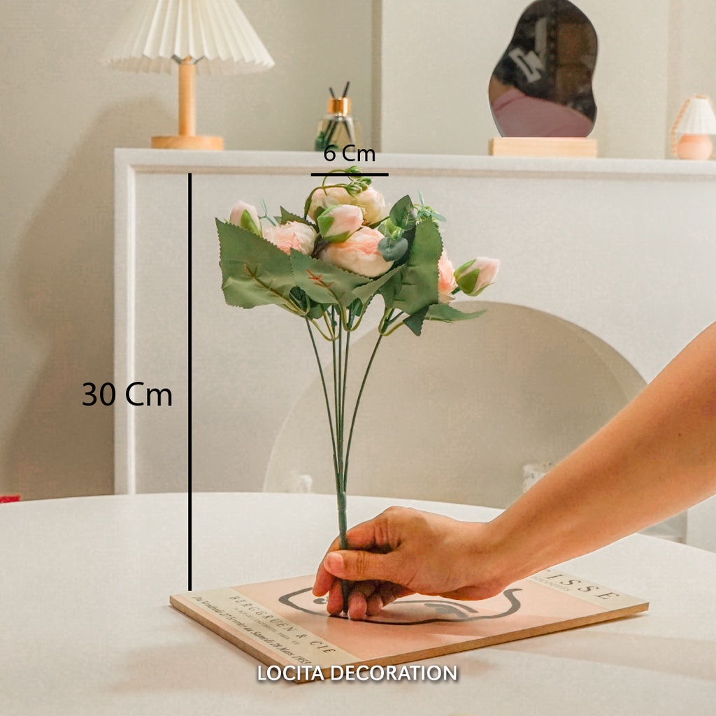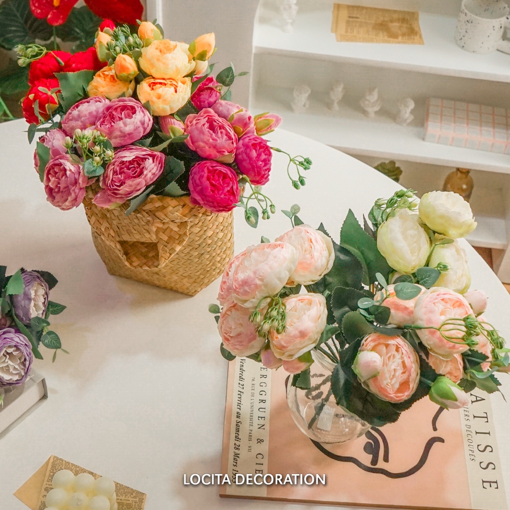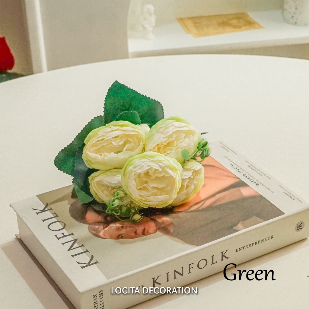 Premium Rose Peony Artificial Bouquet Flower/Buket Bunga Mawar Melati Mekar Kombinasi Daun Dollar