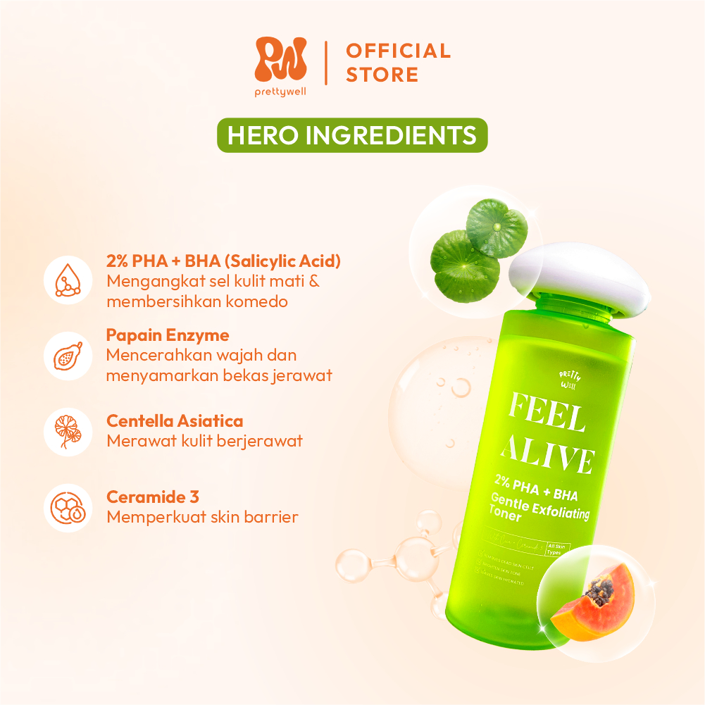 Prettywell Feel Alive 2% PHA + BHA Gentle Exfoliating Toner 100mL Toner Pencerah with Centella Menyegarkan Wajah Eksfoliasi Kulit Sensitif