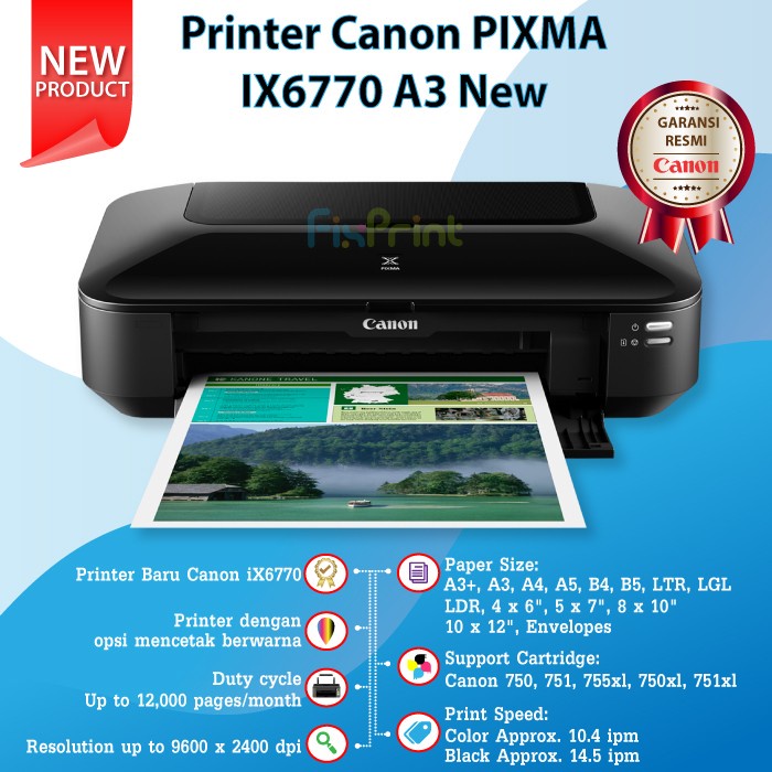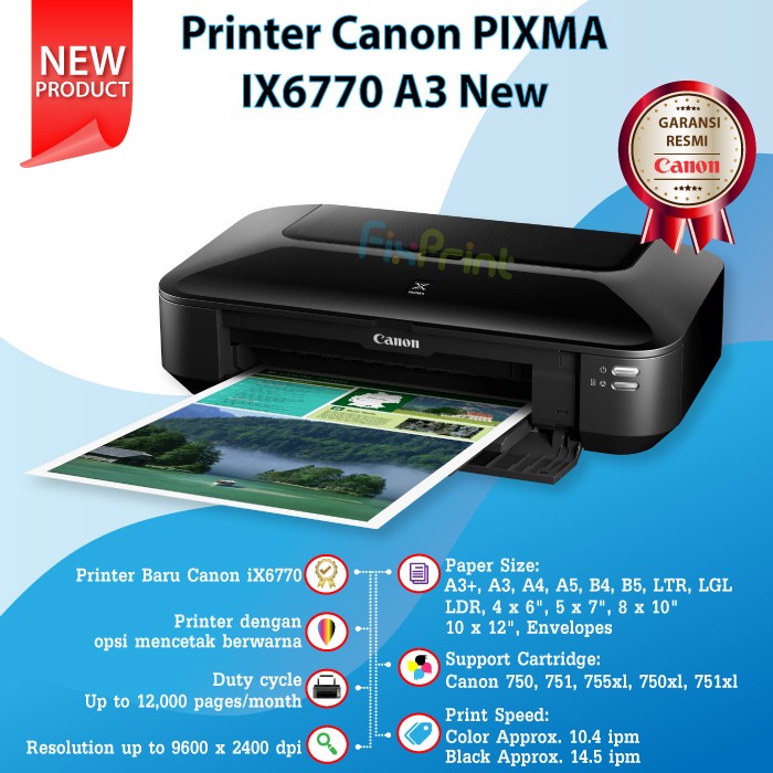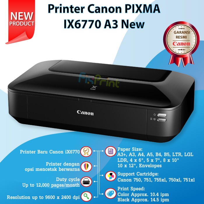 Printer Canon PIXMA iX6770 ix 6770 New Printer A3 IX6770 Cartridge PGI 750 Black CLI 751 Color print Photo Borderless ( Tanta Tepi )