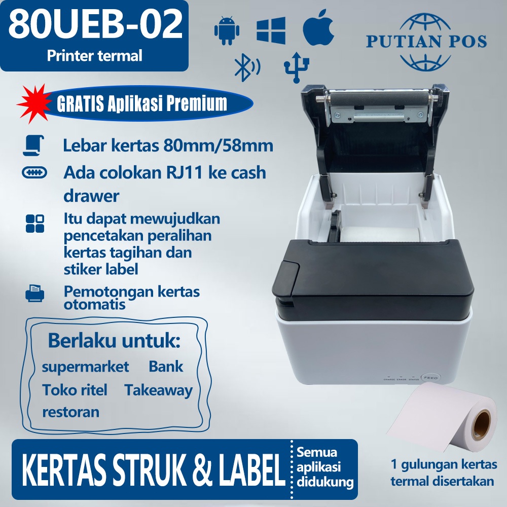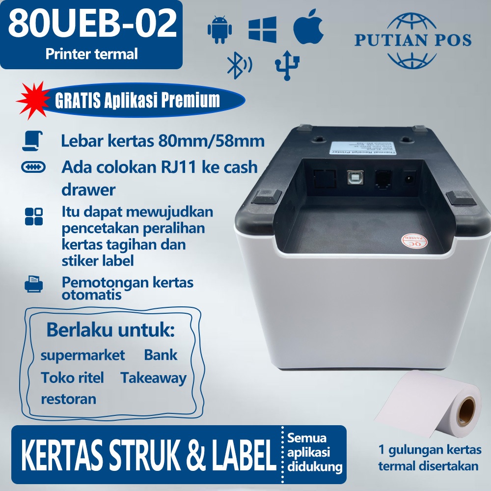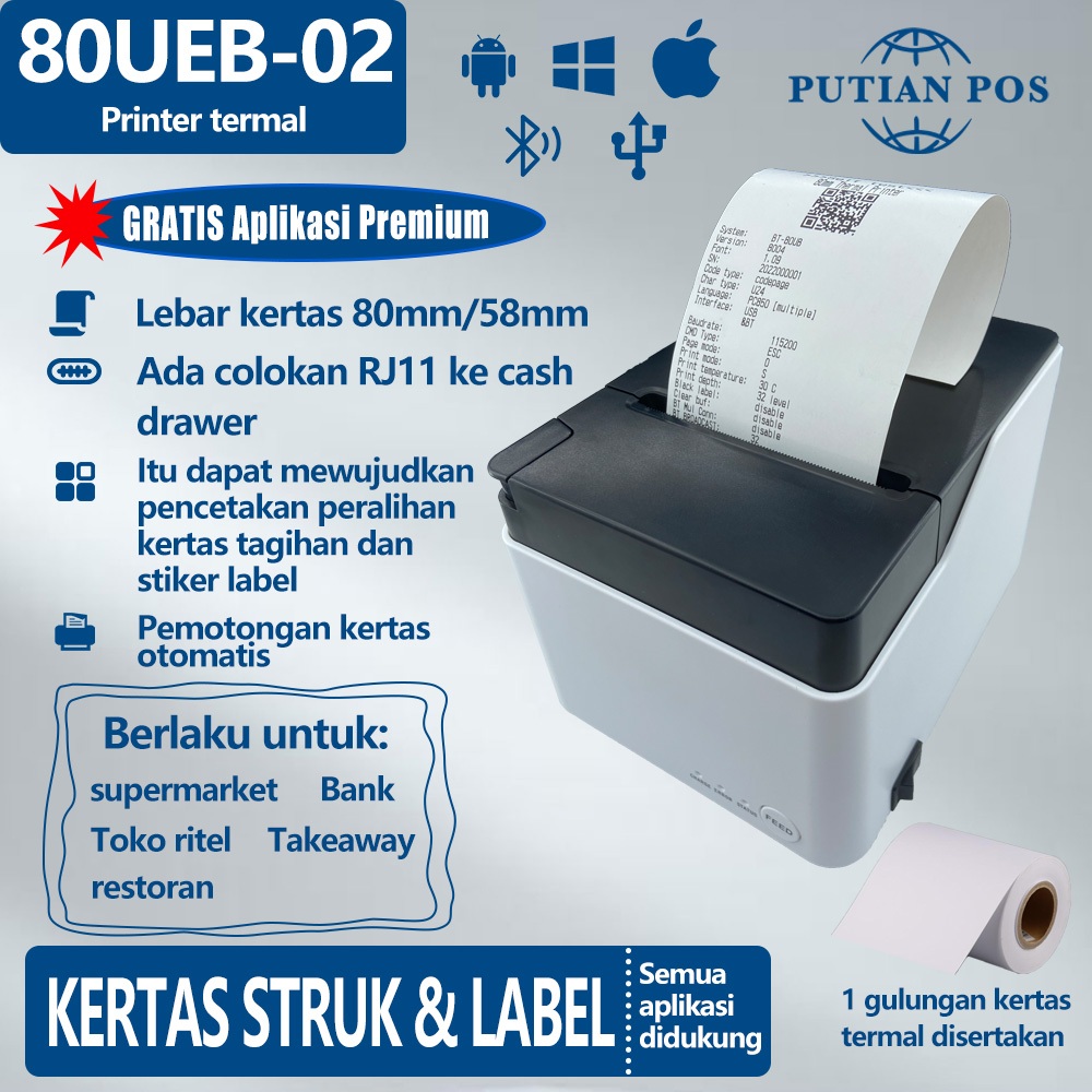 Desktop 58/80mm Printer Termal PUTIAN POS 80UEB-02 Koneksi USB Bluetooth, Pemotongan Otomatis