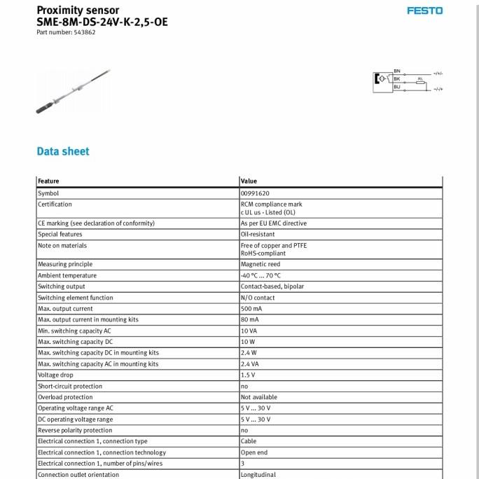 Proximity Sensor FESTO SME-8M-DS-24V-K2,5-OE Pn.543862 FESTO.