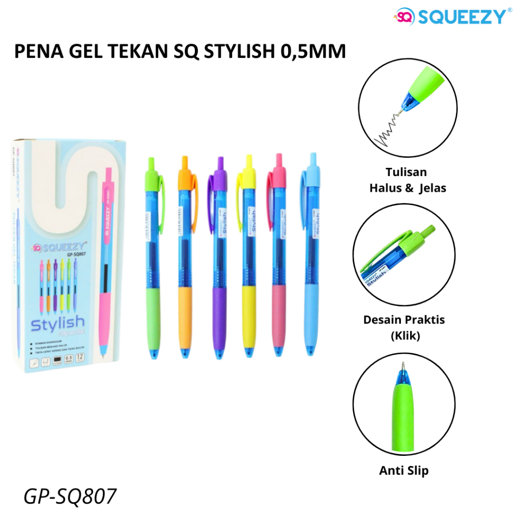 Pulpen Gel Tekan Warna | Gel Pen Click Colour SQ 0.5mm SQ807 (1Pck)