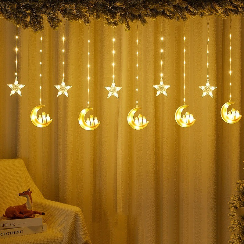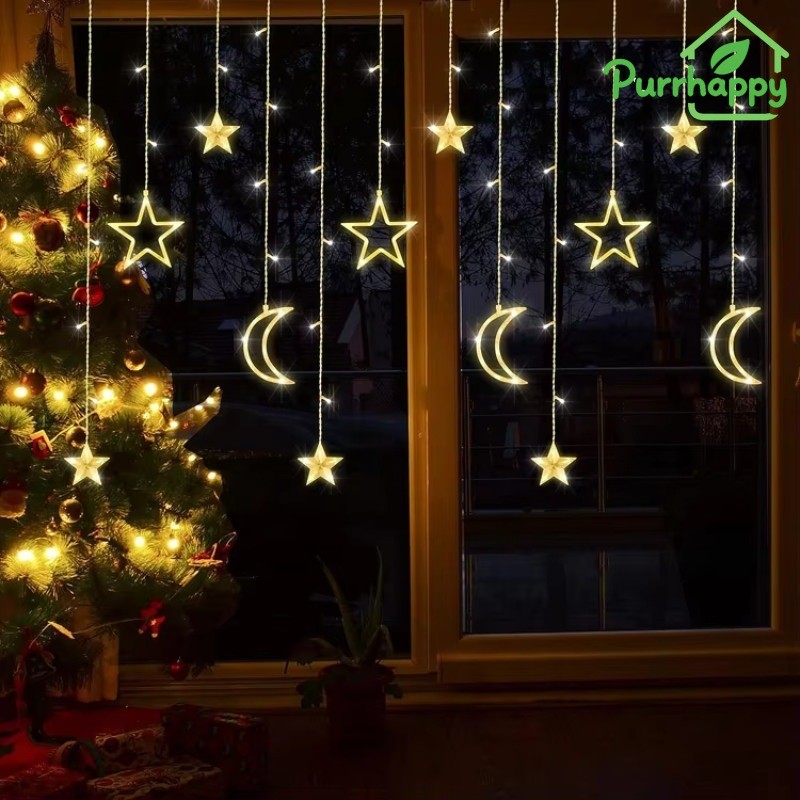 Purrhappy 3.5M Lampu Ramadhan Ramadhan Lampu Hias Dekorasi Idul Fitri Lampu LED Hias Lampu 8Modes Lampu LED Lampu Hias Lampu LED Bintang Bulan Tirai Lampu Tirai Bintang Bulan Waterproof Lampu Kamar Aesthetic Lampu Hias Kamar with EU Plug