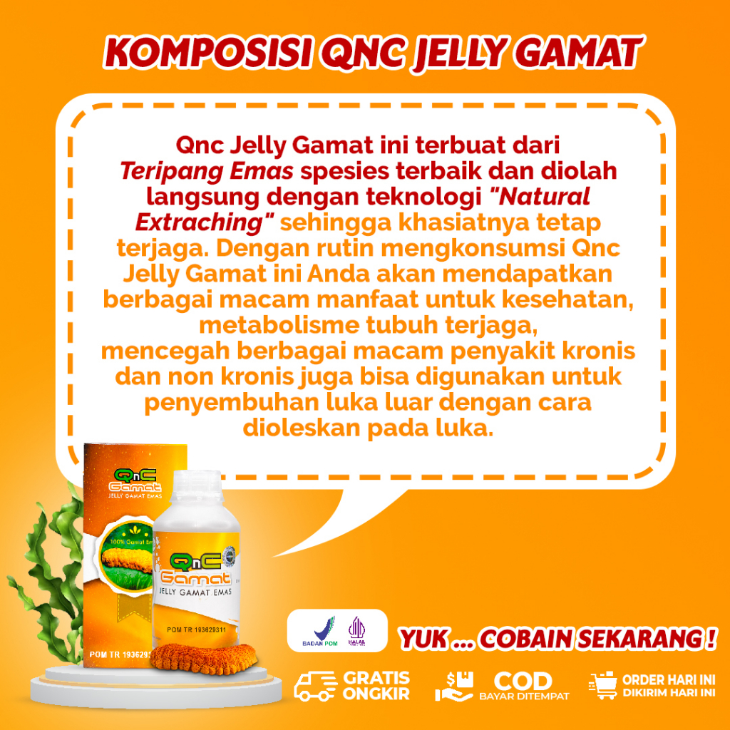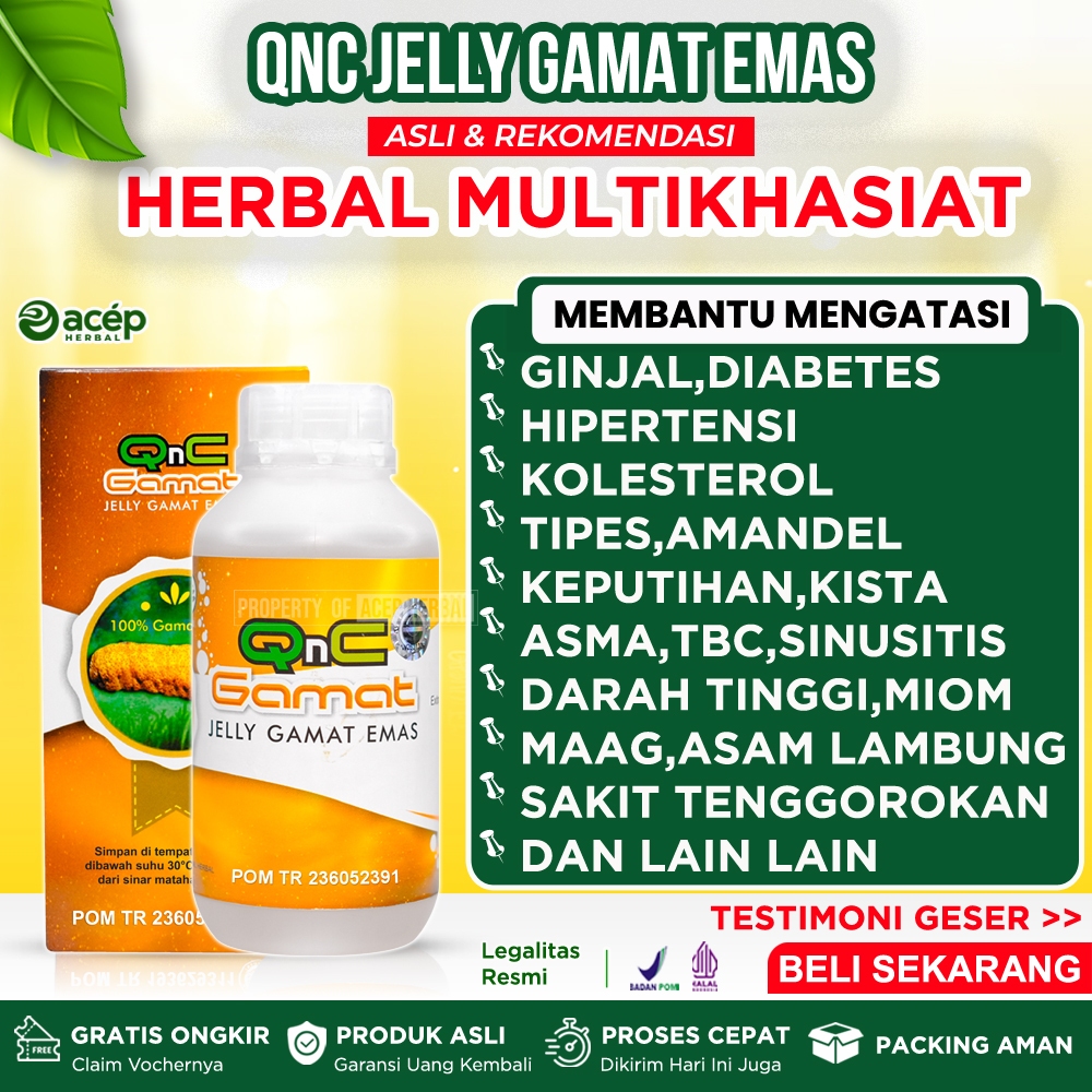 Obat Ginjal Amandel Hipertensi Patah Tulang Diabetes Tipes Keputihan Kista Miom Asma Sinusitis Stroke Luka Bakar Radang Tenggorokan TBC Psoriasis Kolesterol Darah Tinggi Maag Lambung Batu Empedu QNC Jelly Gamat Emas Original Asli 100% Jeli Gold G Jely Ori