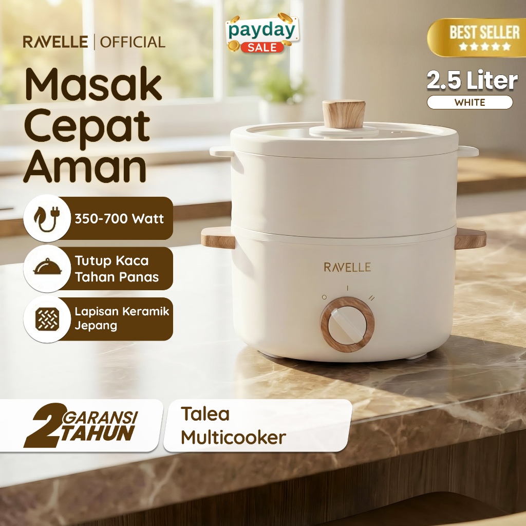 Ravelle - Talea Multicooker low watt 1.5 Liter / Panci kukus listrik ceramic coating + steamer