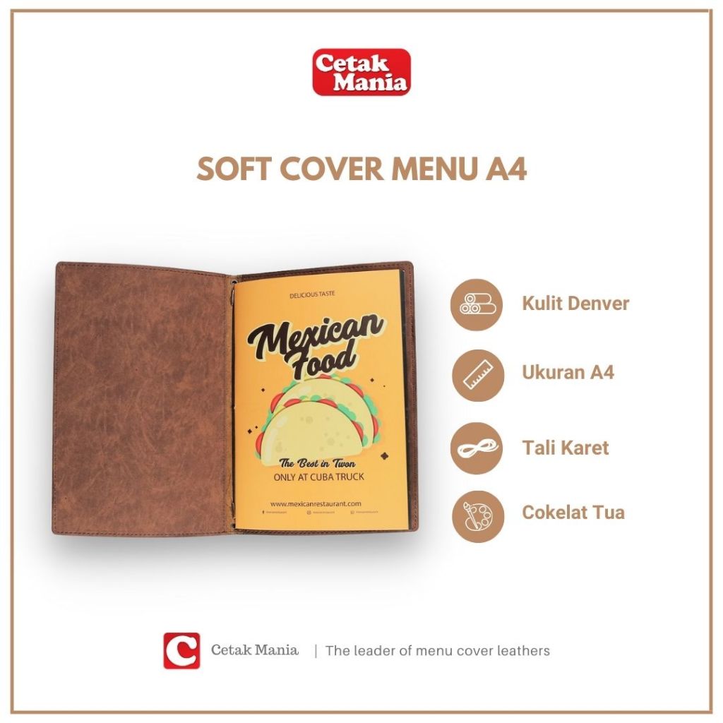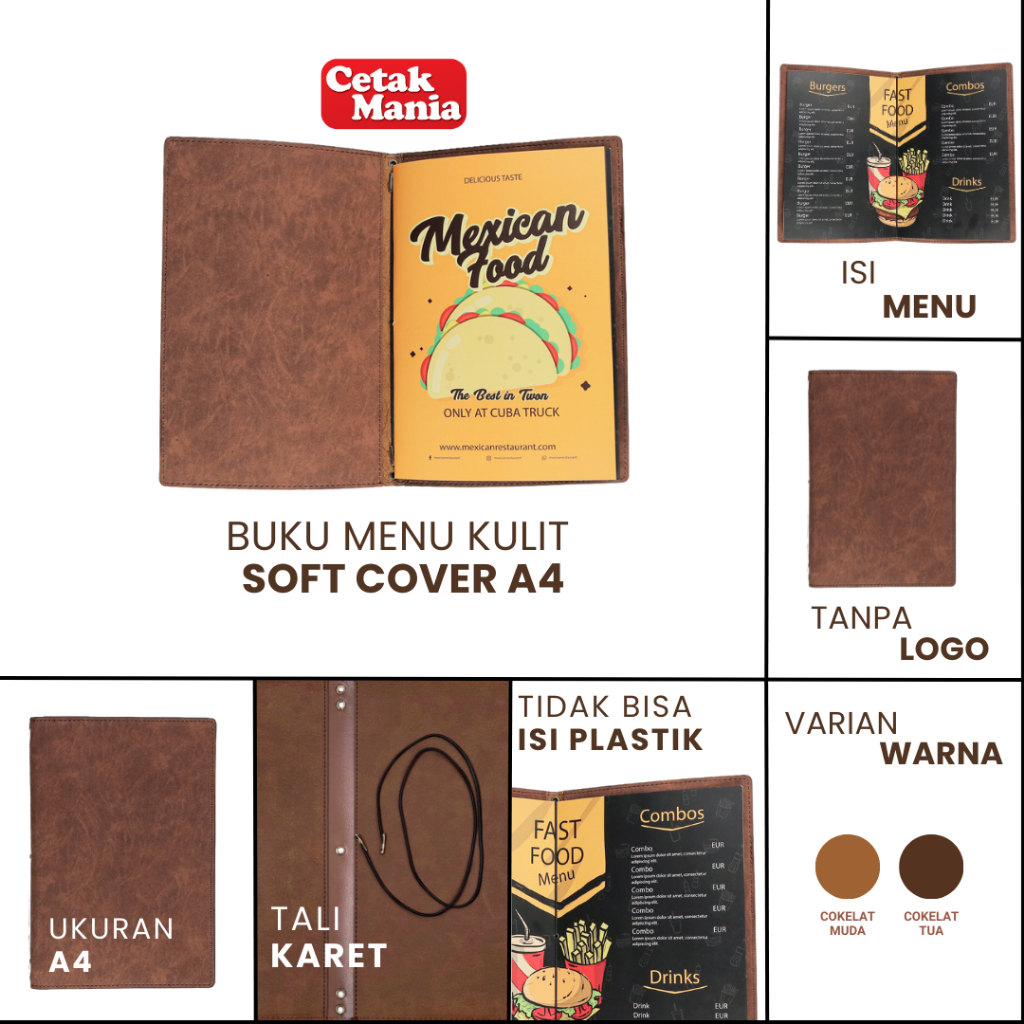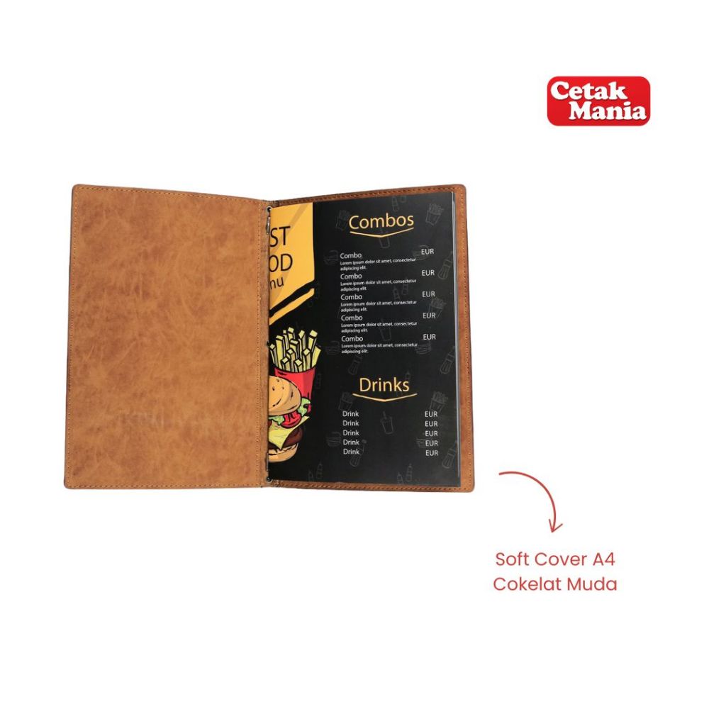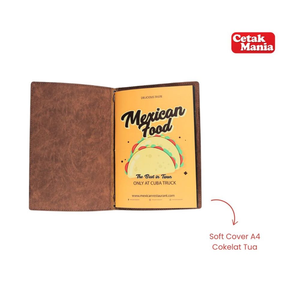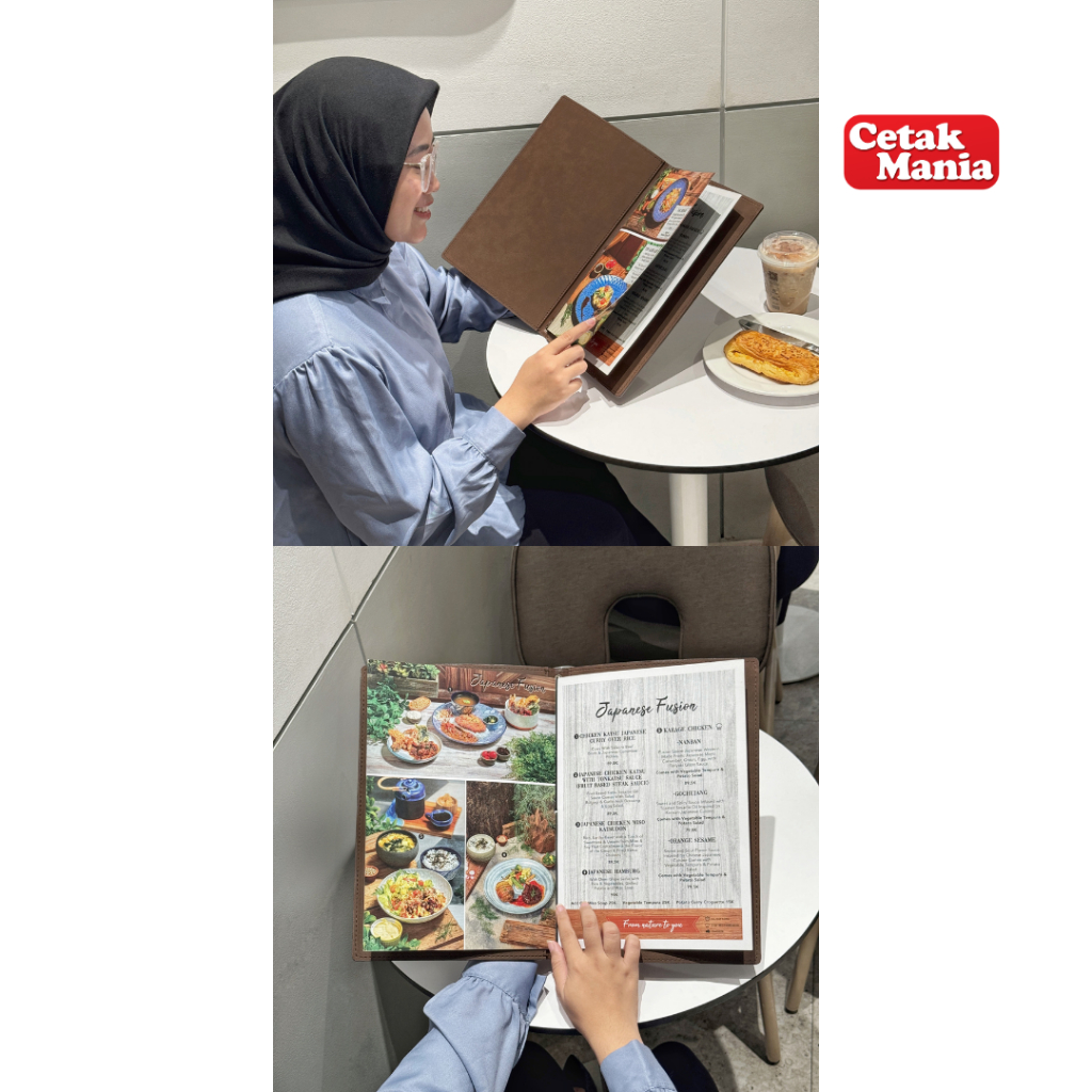 Cetak Mania - Buku Menu Kulit Soft Cover A4 Jepit Tali Karet Japanesse Binding Coklat tua dan Coklat Muda- Cafe, Coffee Shop, Restoran, Hotel