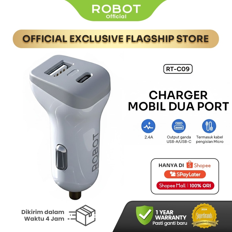 ROBOT RT-C09 Car Charger Colokan Mobil 2 Port USB & Type C 2.4A Pengisian Cepat Kompatibel Semua Kendaraan Charger Mobil Mini Portabel Aman untuk iPhone & Android Original - Garansi Resmi 1 Tahun