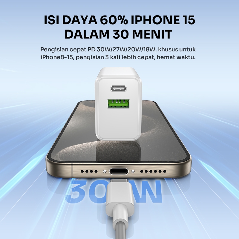 ROBOT Set Kepala Charger Fast Charging 30W Dual Port Adapter Kabel Data Type C iPhone Android Quick Charging 3.0 RT-P30 Original - Garansi 1 Tahun