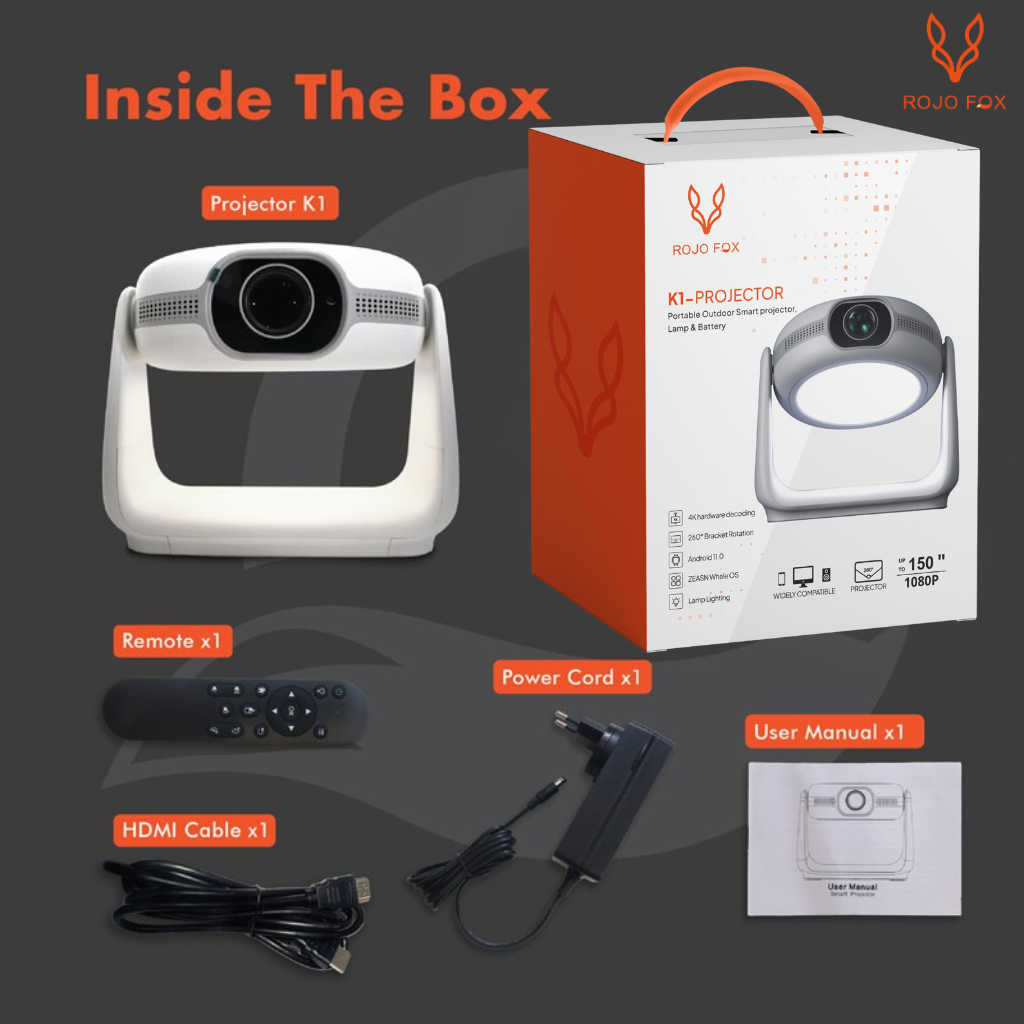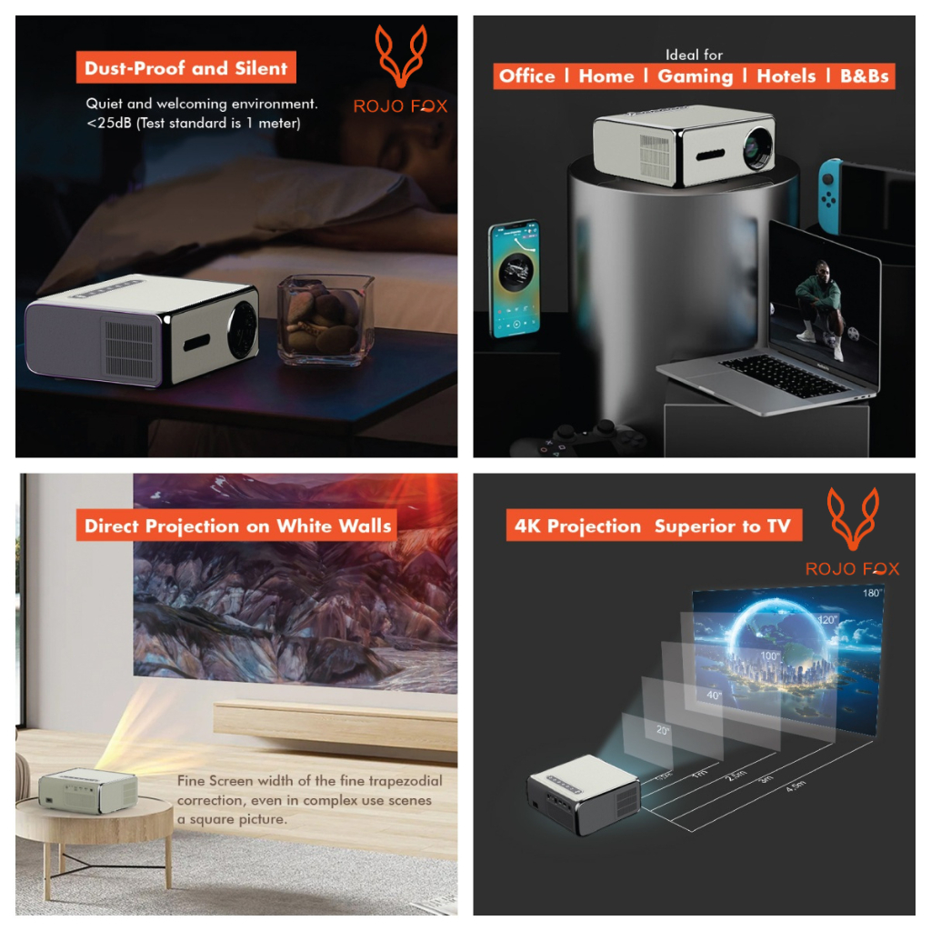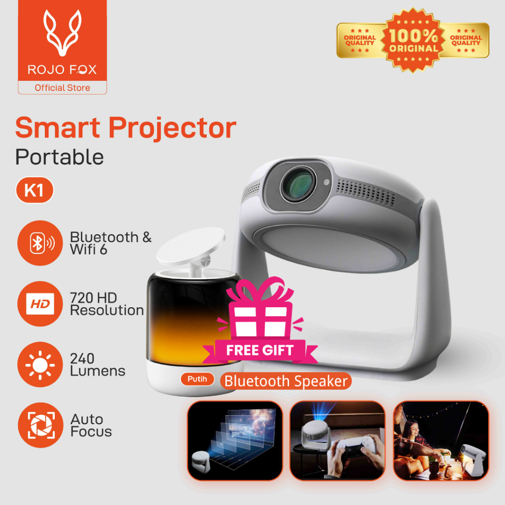 ROJO FOX Proyektor Mini Android K1/YP530 | HD 720p | 240 ANSI Lumens | Bluetooth & WiFi | Smart Android Projector | Home Theater & Presentasi Kantor | POSTEL Certified