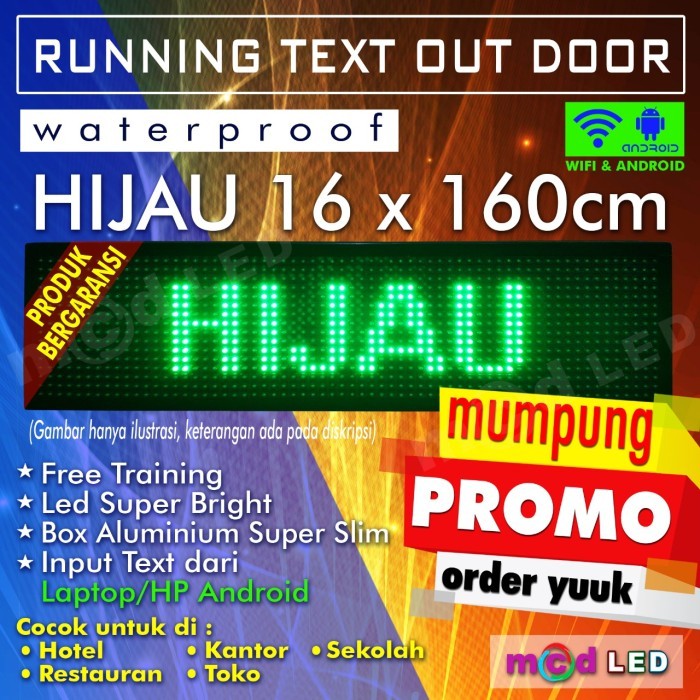 RUNNING TEXT RUNNINGTEXT LED DISPLAY P10 OUTDOOR OUT DOOR WARNA MERAH HIJAU KUNING PUTIH BIRU OUTDOOR UKURAN 16X160 CM