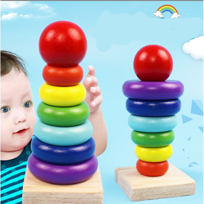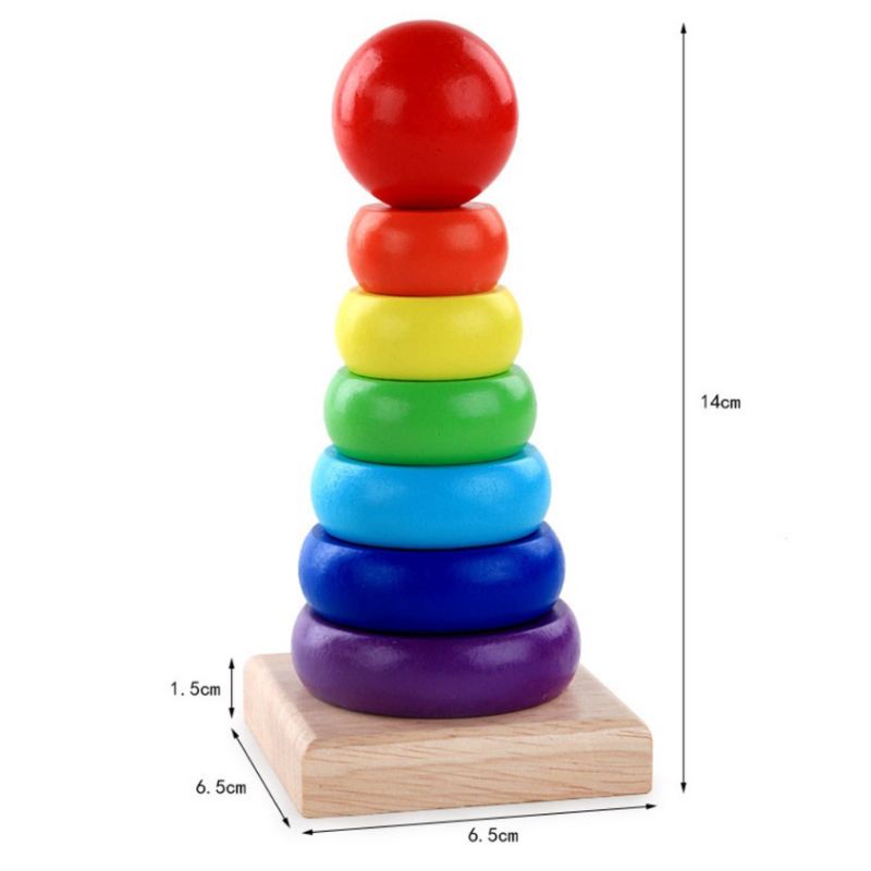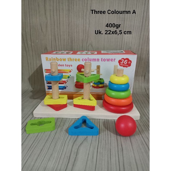 Rainbow Three Coloumn, Mini Rainbow Block Stacking Tower Kayu Edukasi