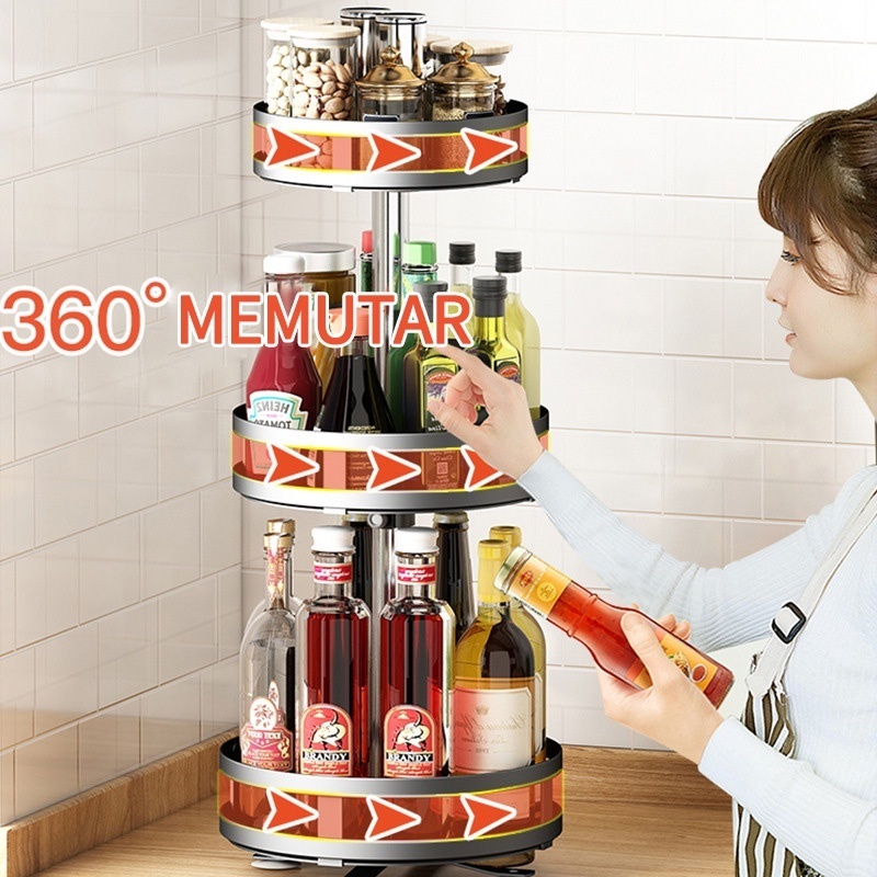 Rak Bumbu Stainless Steel Putar 360 Derajat Rak Penyimpanan Dapur Rak Bumbu Dapur 3 Susun Tempat Bumbu Dapur Serbaguna
