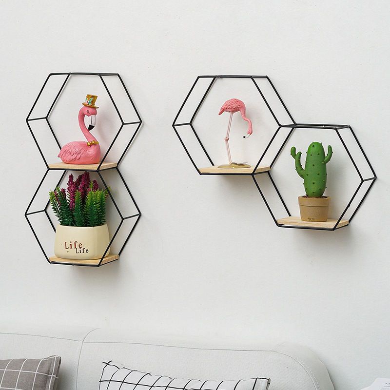 Rak Hiasan Hexagonal Gantung Dinding Stainless / Kotak Kerangka Gantung Buku Boneka Tanaman Emas
