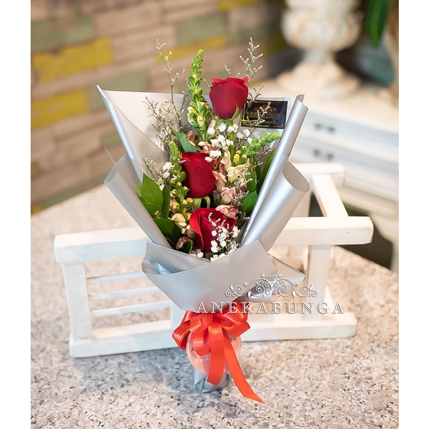 Rangkaian Buket Bunga Mawar Merah Segar Asli Small Compact Red Rose Hand Bouquet Fresh Flower Cheap Bucket Hadiah Ucapan Ulang Tahun Kado Happy Wedding Anniversary Birthday Wisuda Graduation Bungkus Silver Free Greeting Card Ultah Gift Kecil Mini Bagus