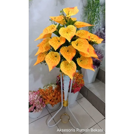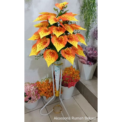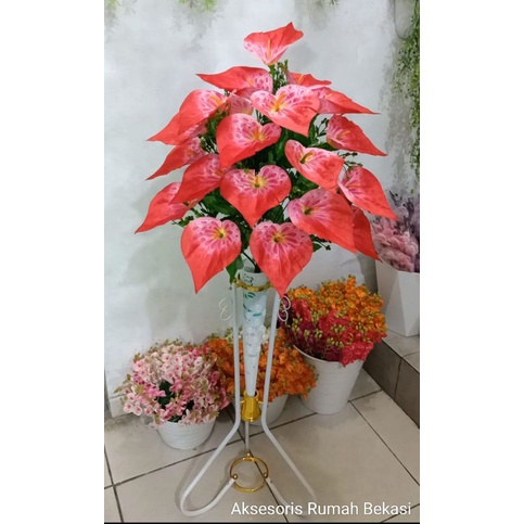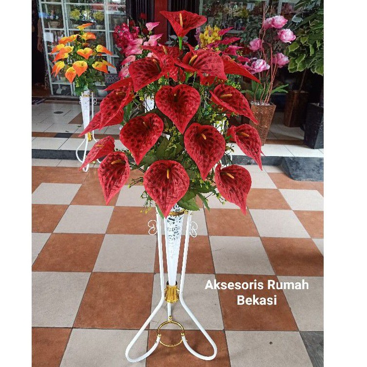 Rangkaian bunga anthurium / bunga Aron panda dengan pot standing besi bunga sudut ruangan