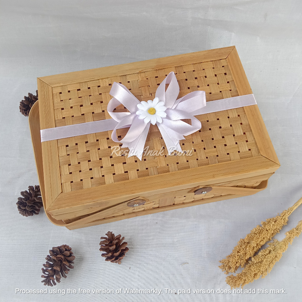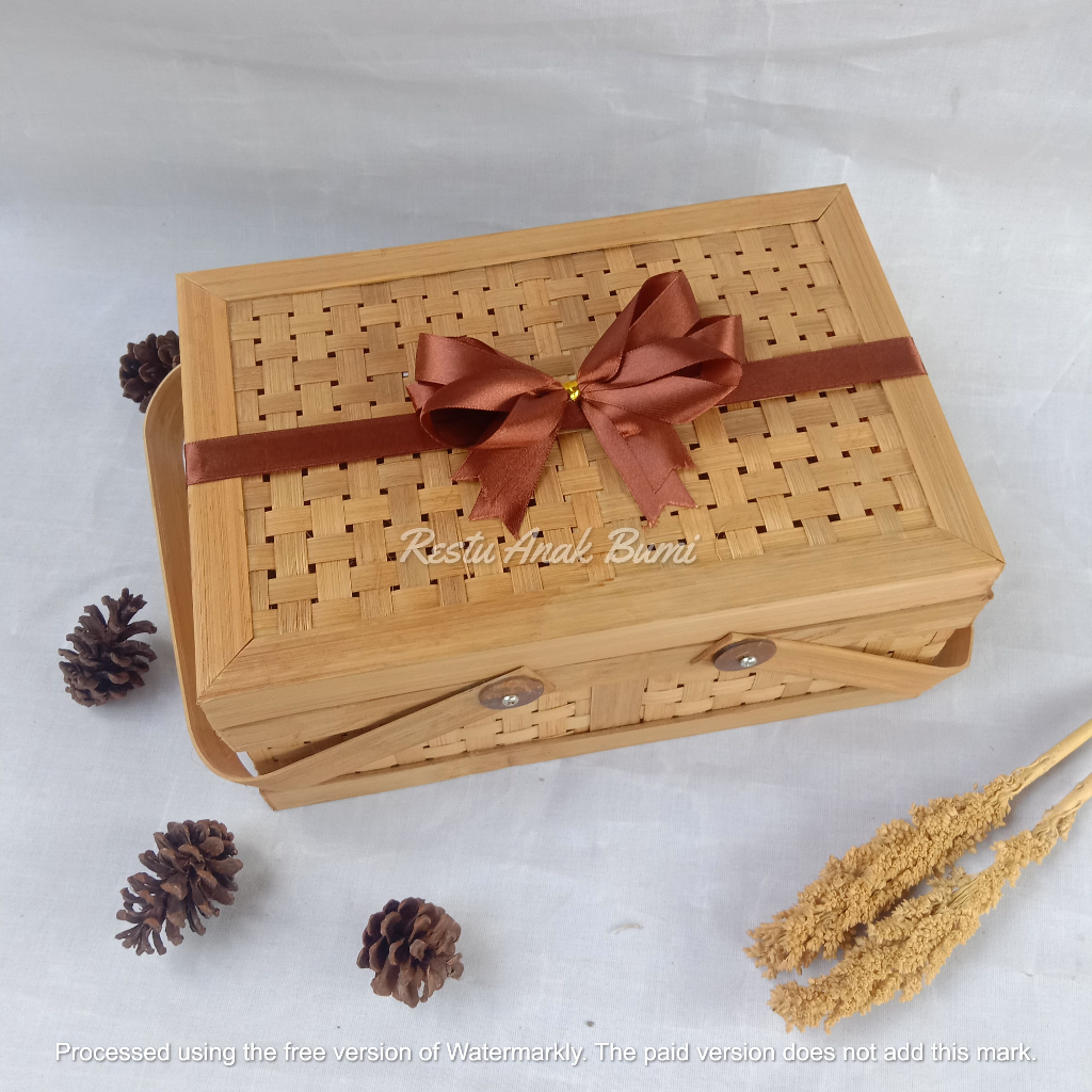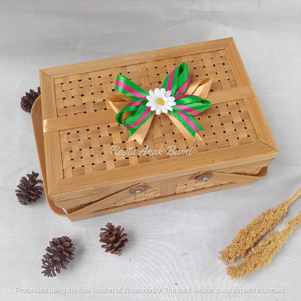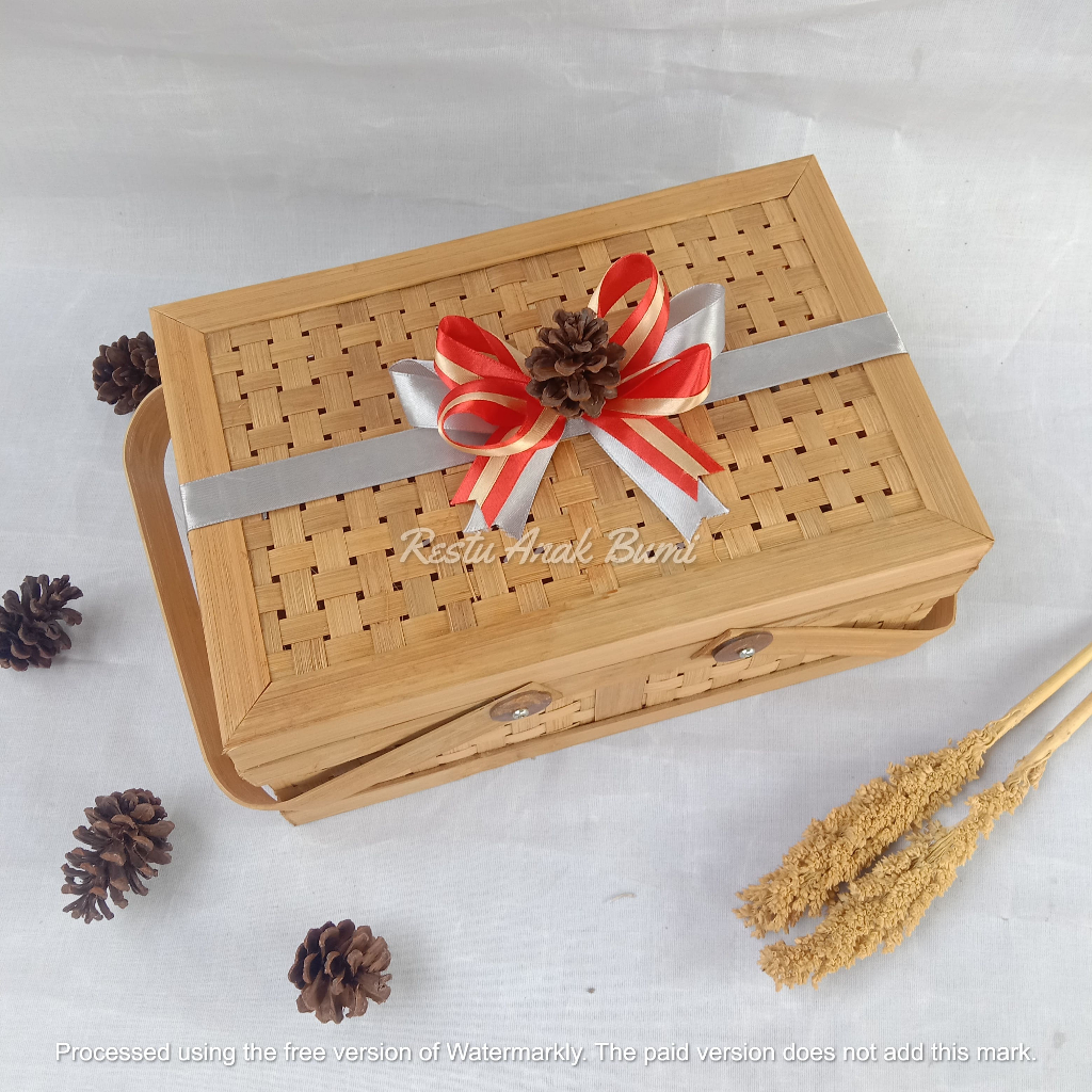 Rantang Persegi Panjang 30 x 20cm & 28x18cm Pita | rantang kotak anyaman bambu | wadah hampers kotak bambu | box hantaran bambu | tempat wajik kemasan | hampers makanan | seserahan unik | hampers bambu | wadah kue kering | wadah buah ( R2030 )
