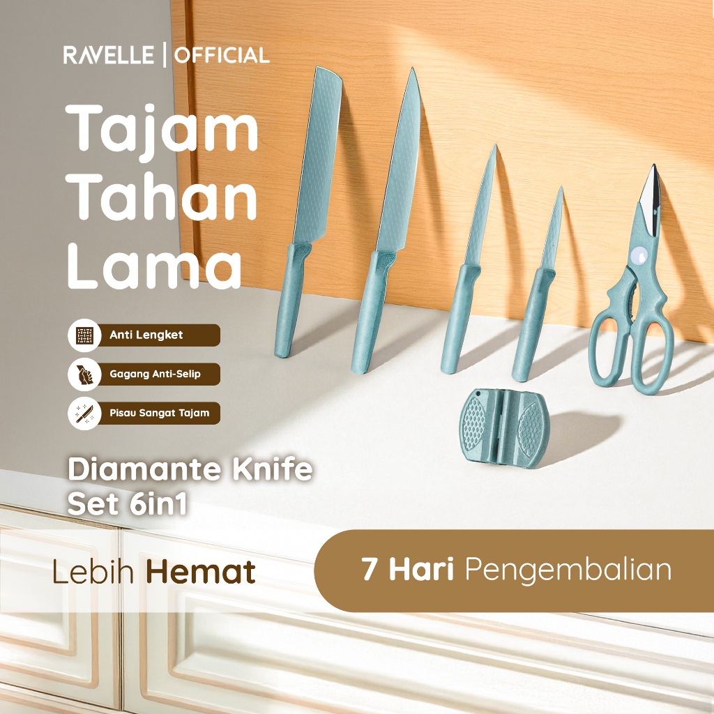 Ravelle - Diamante Knife set 6in1 gunting pengasah / Pisau dapur masak stainless steel anti lengket