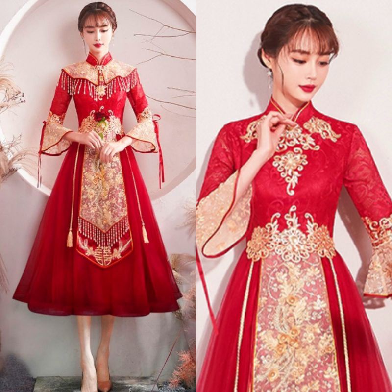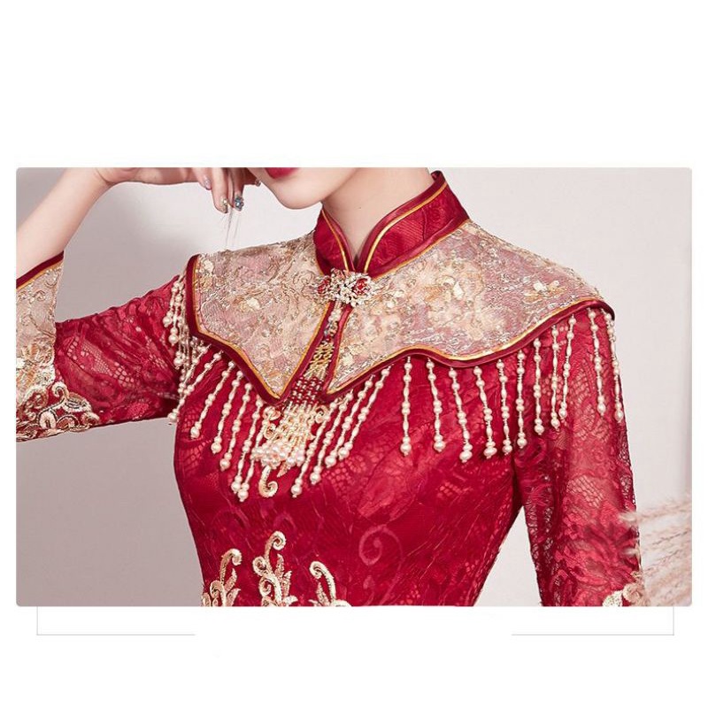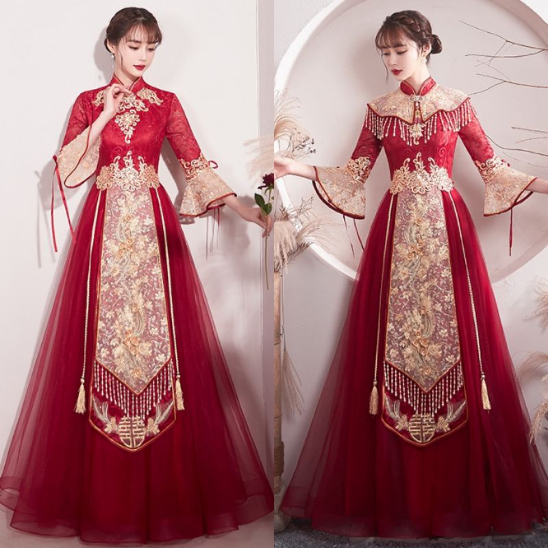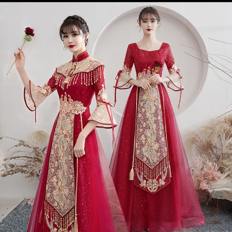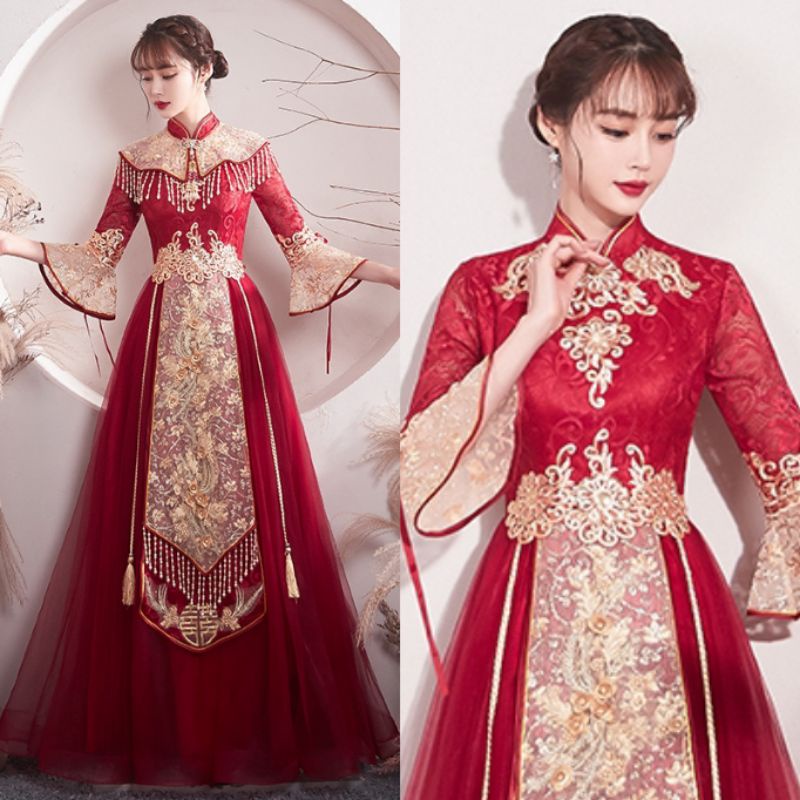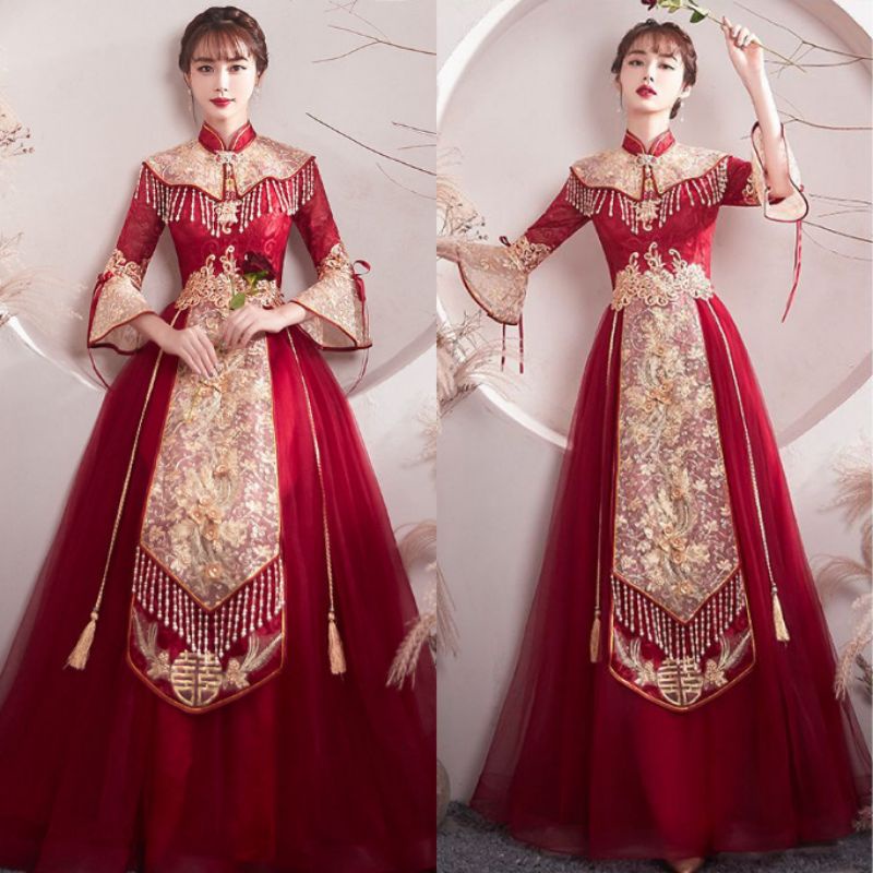 Realpic G999 XS-3XL Gaun mewah impor cheongsam sangjit merah gold gaun chinese wedding maroon gold gaun bridal
