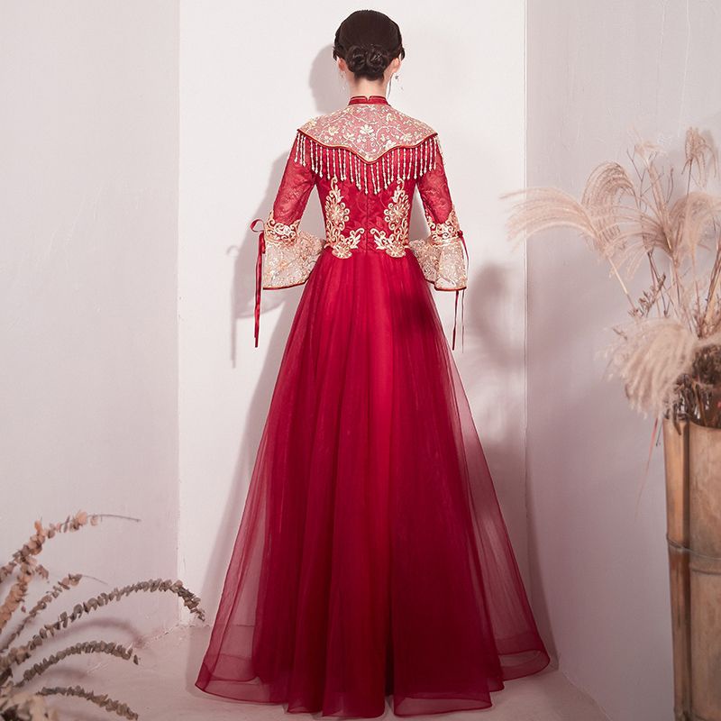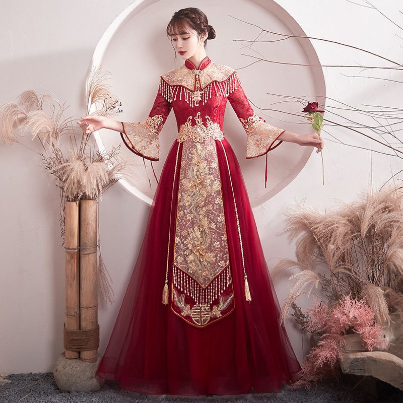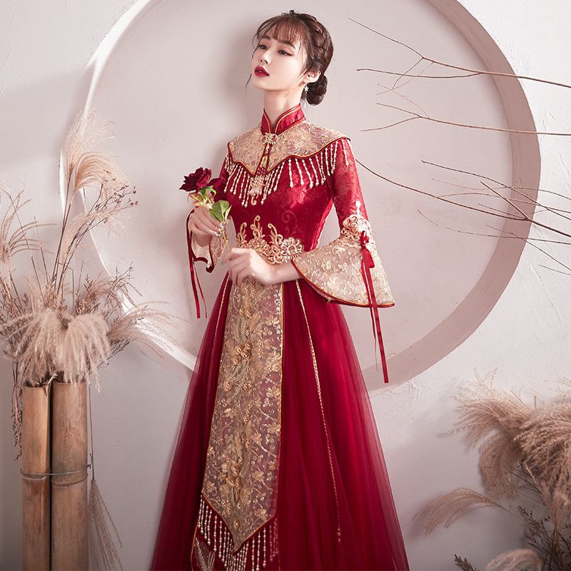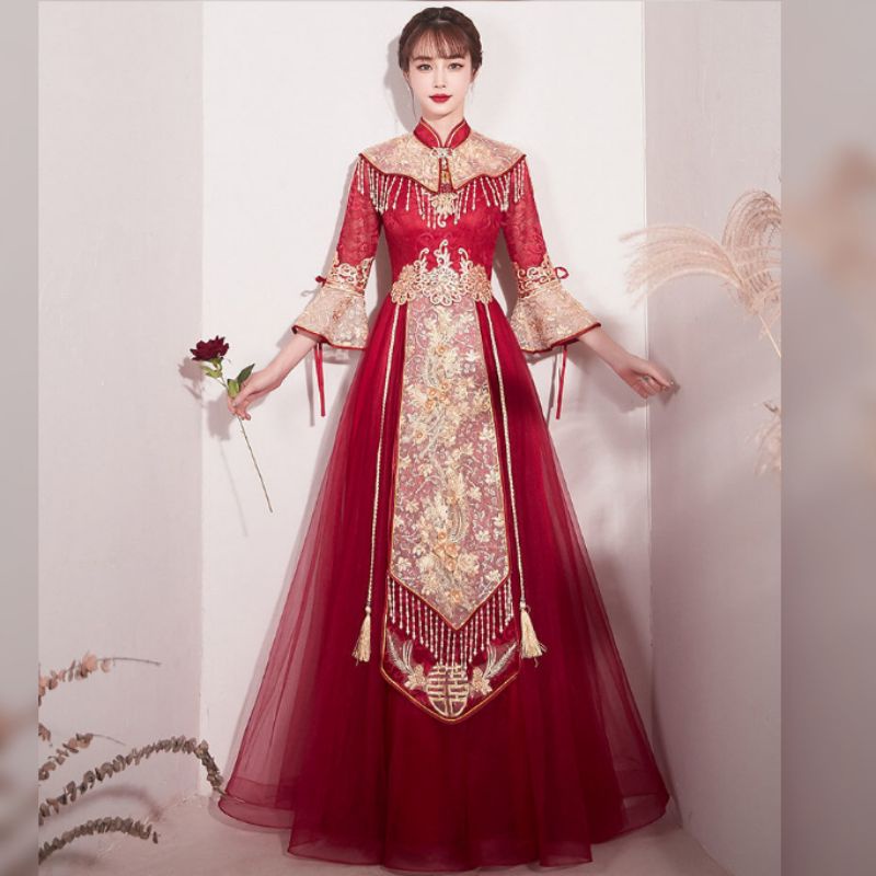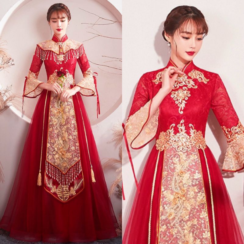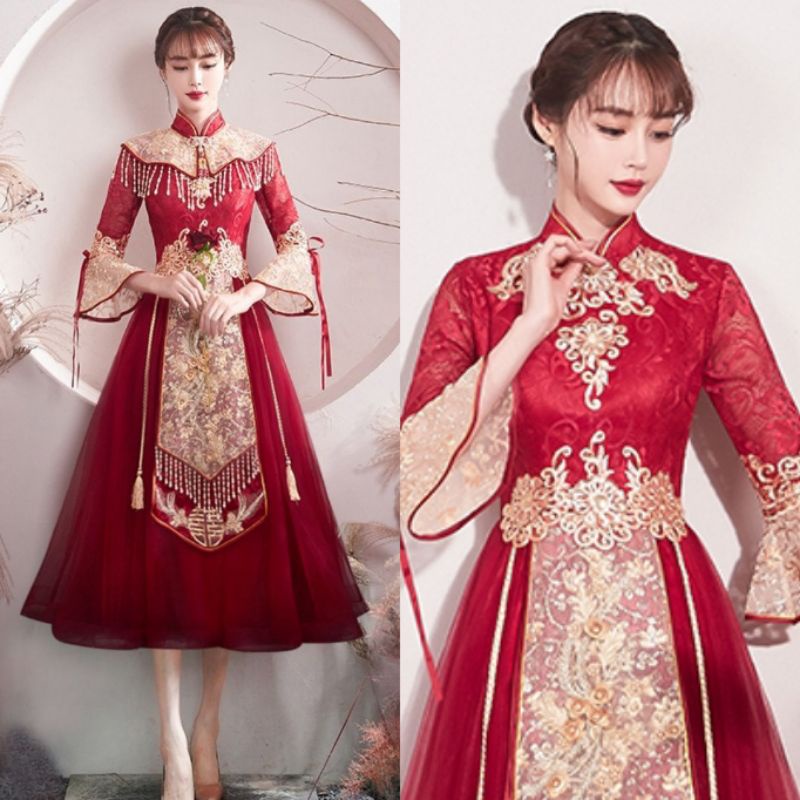 Realpic G999 XS-3XL Gaun mewah impor cheongsam sangjit merah gold gaun chinese wedding maroon gold gaun bridal