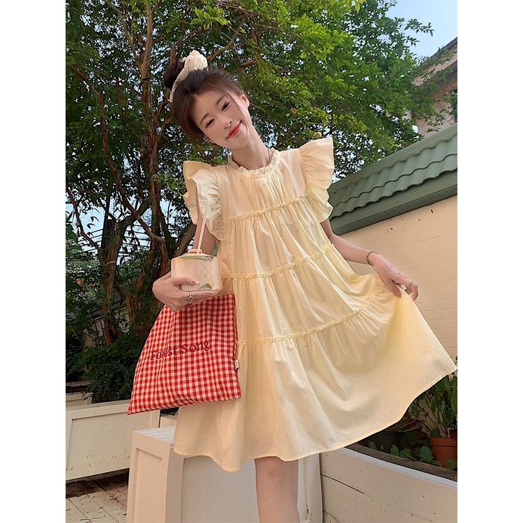 Red Gaun lengan terbang merah muda manis dan lembut musim panas wanita 2023 orang kecil baru rok A-line longgar dan tipis