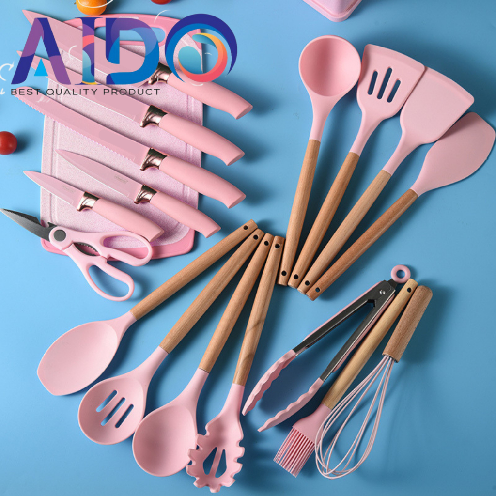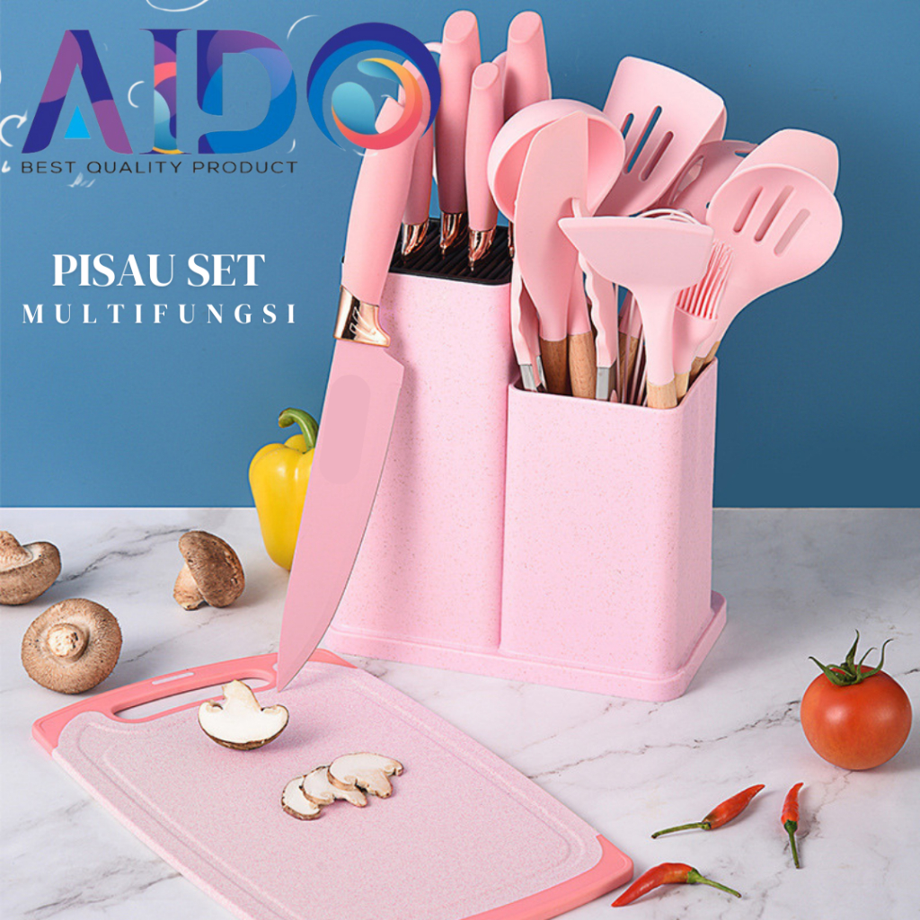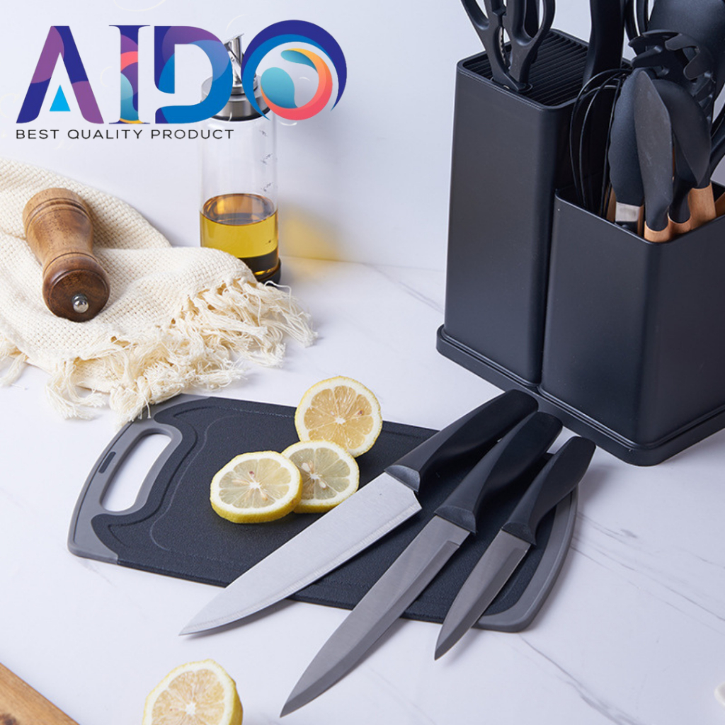 AIDO Alat Dapur Spatula set silikon & pisau set wadah talenan Kitchen Spatula Pisau Set 19 in 1