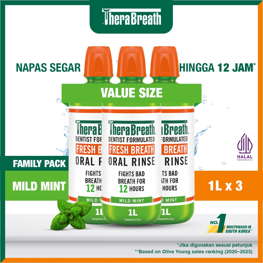 TheraBreath Mouthwash Mild Mint 1L x3 – Obat Kumur Premium, Formula Dokter Gigi, Nafas Segar & Bebas Alkohol