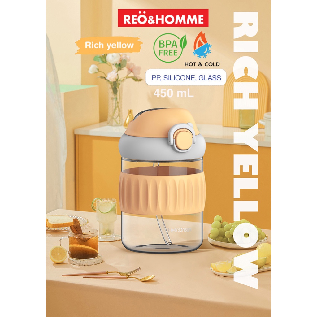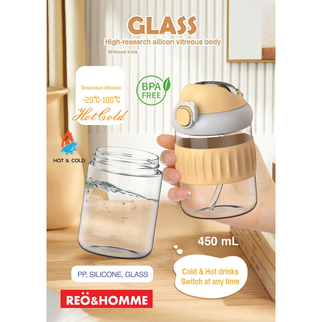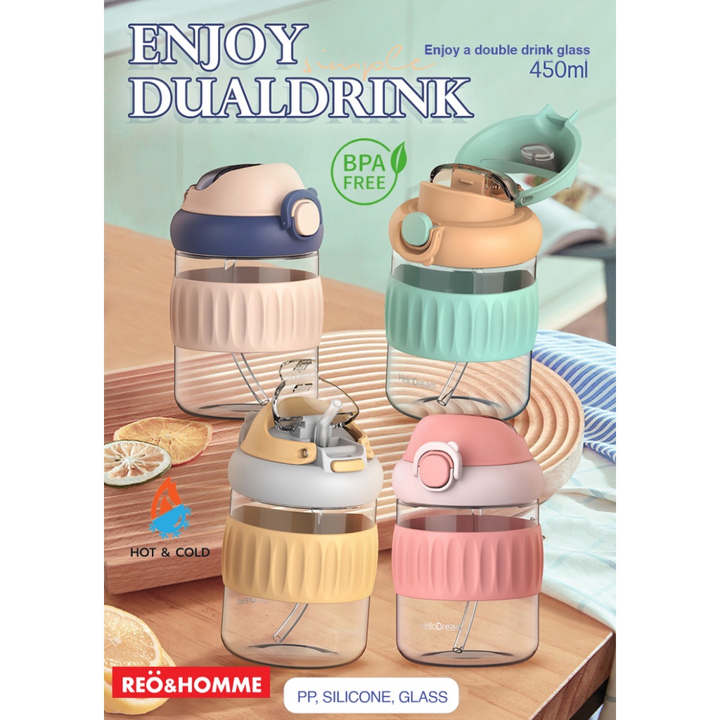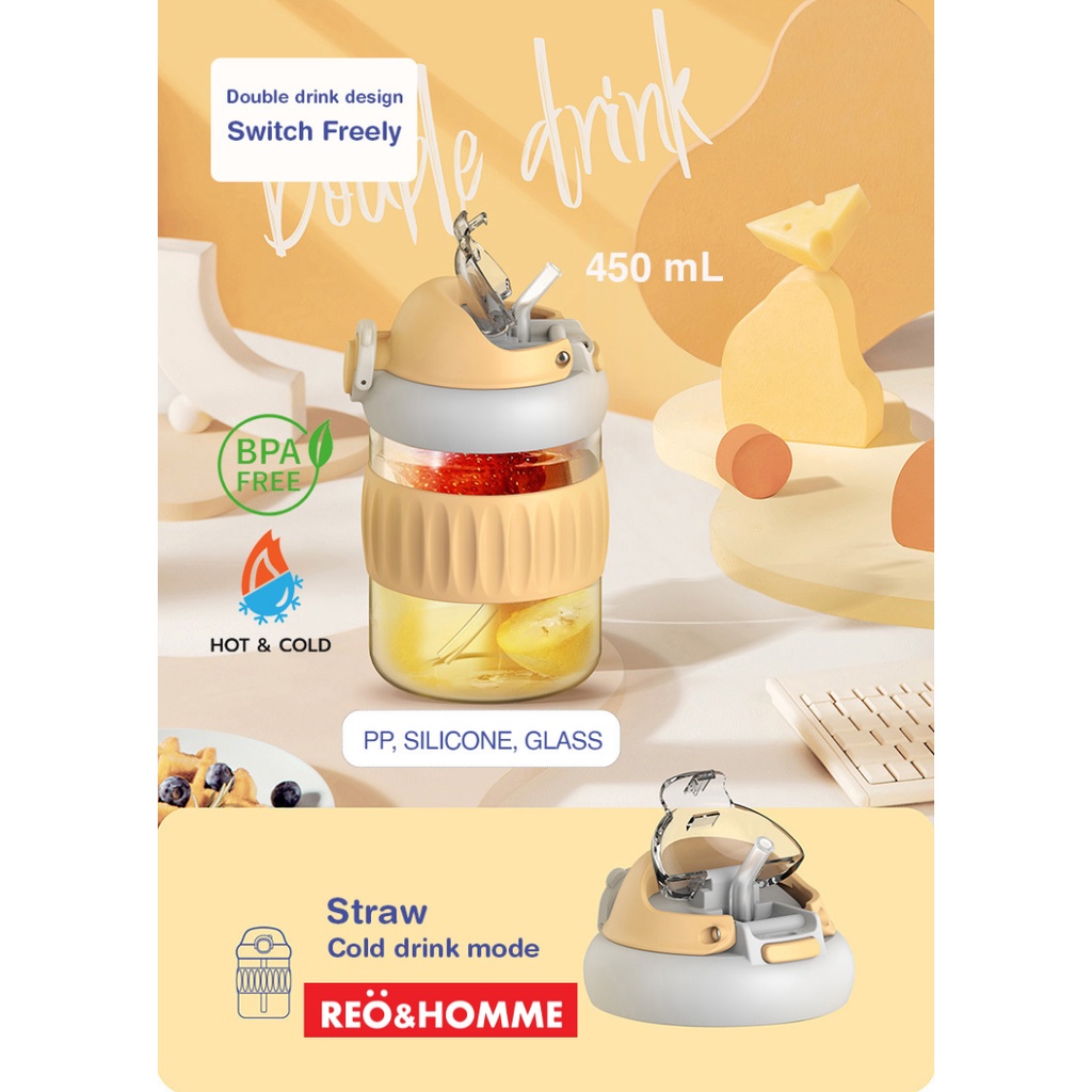 Reo&Homme Botol Minum Kaca Dengan Sedotan & Silikon Mug Gelas Kopi 450 ML Borosilicate Glass Bottle Dual Drink with Silicone Grip H-6342