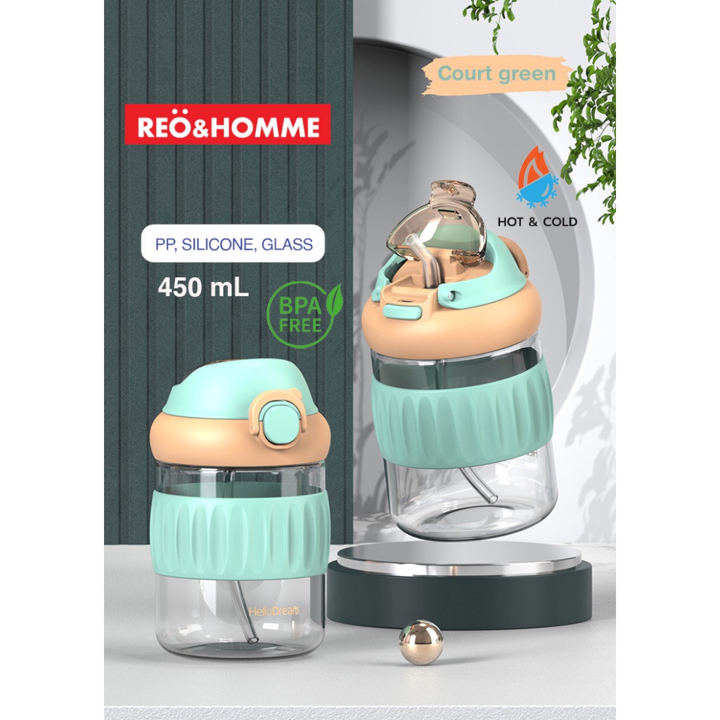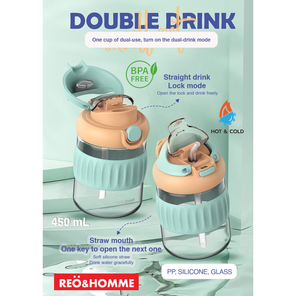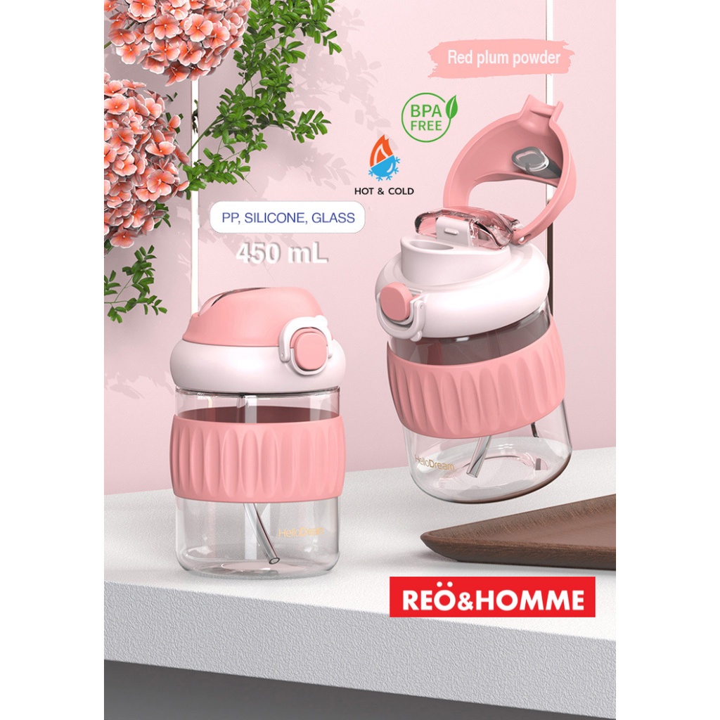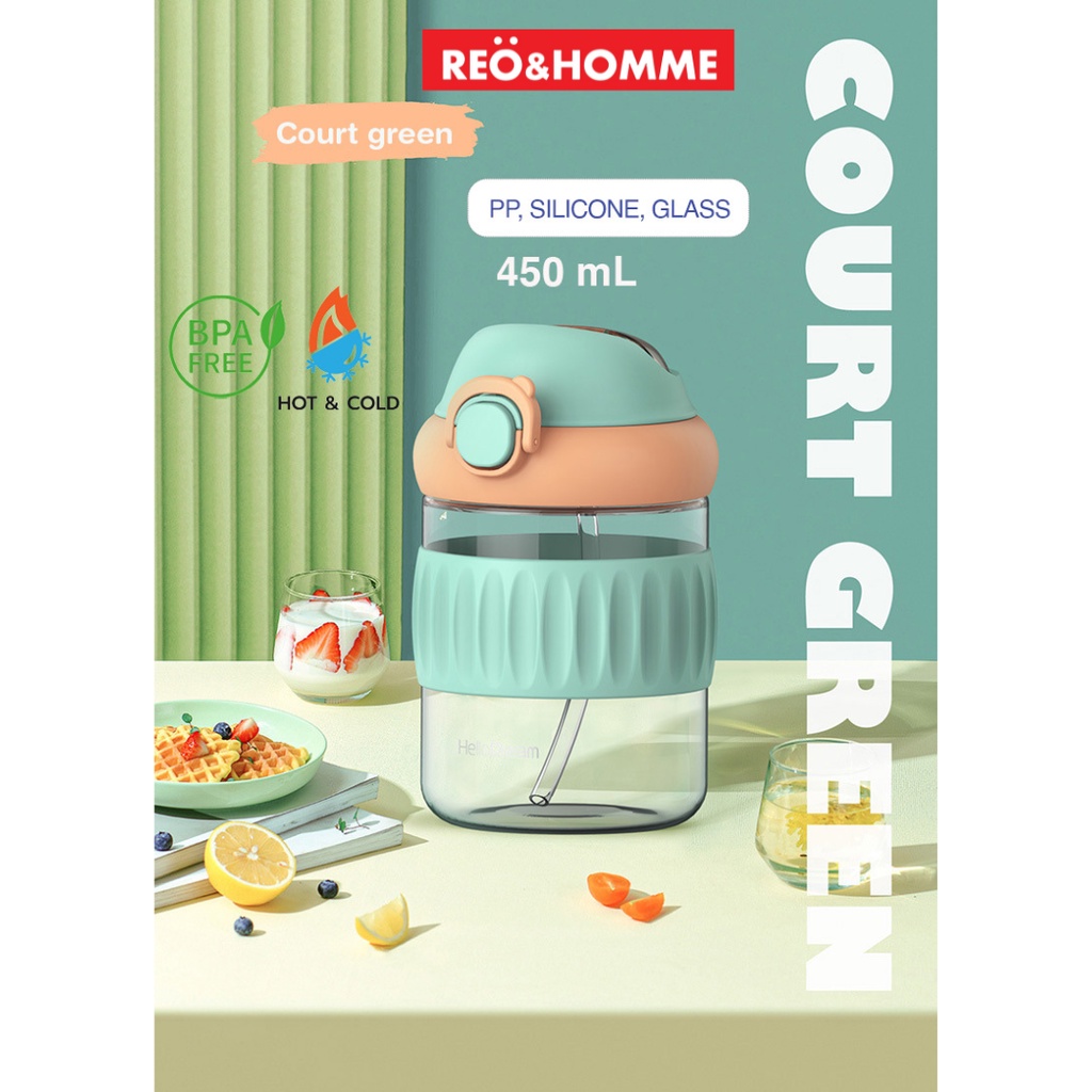 Reo&Homme Botol Minum Kaca Dengan Sedotan & Silikon Mug Gelas Kopi 450 ML Borosilicate Glass Bottle Dual Drink with Silicone Grip H-6342
