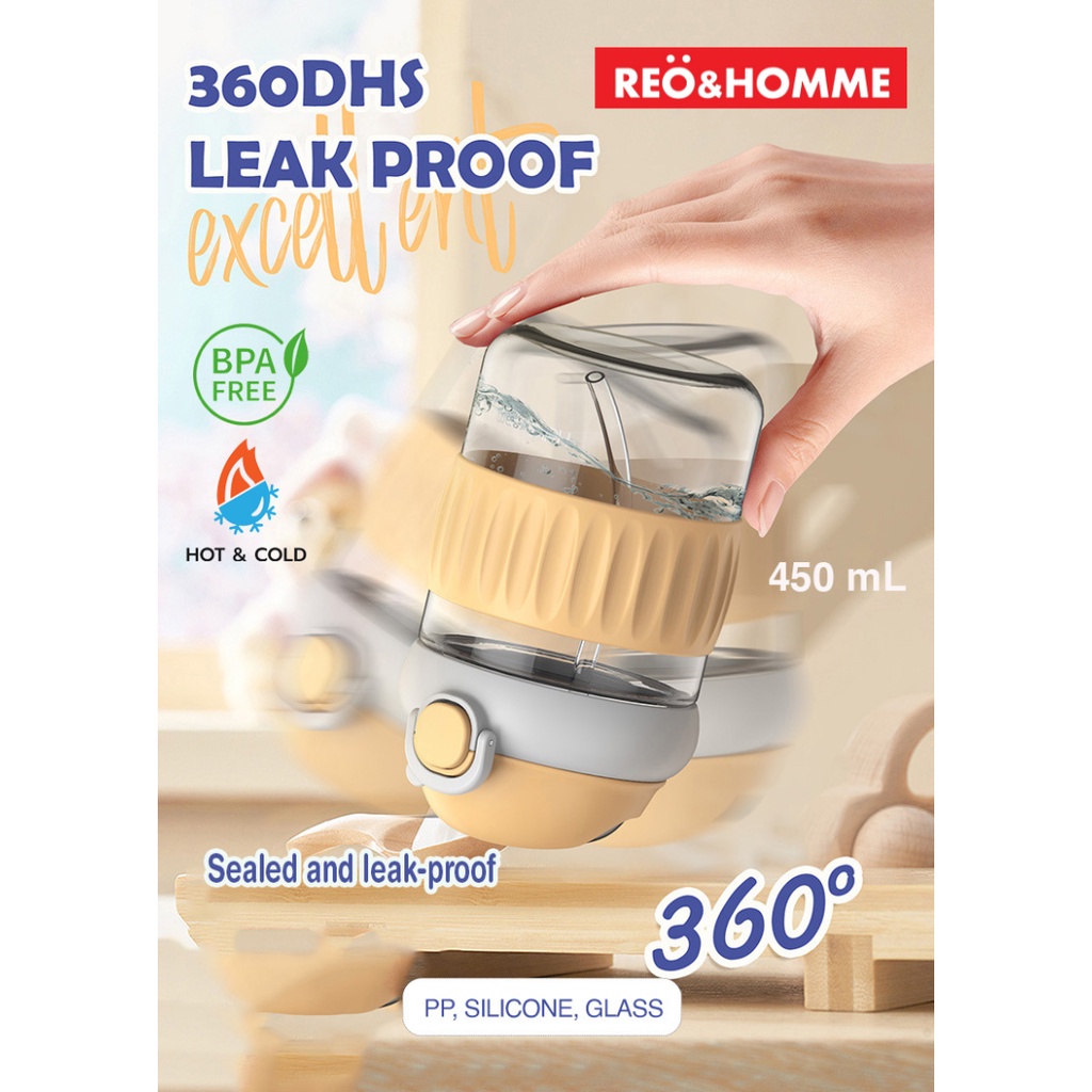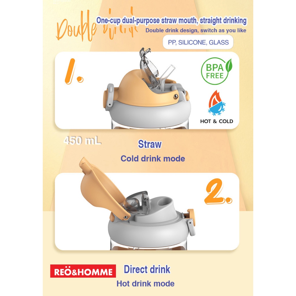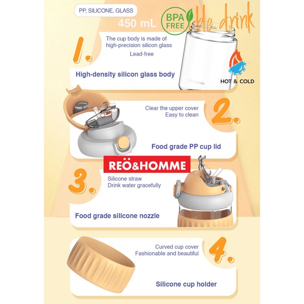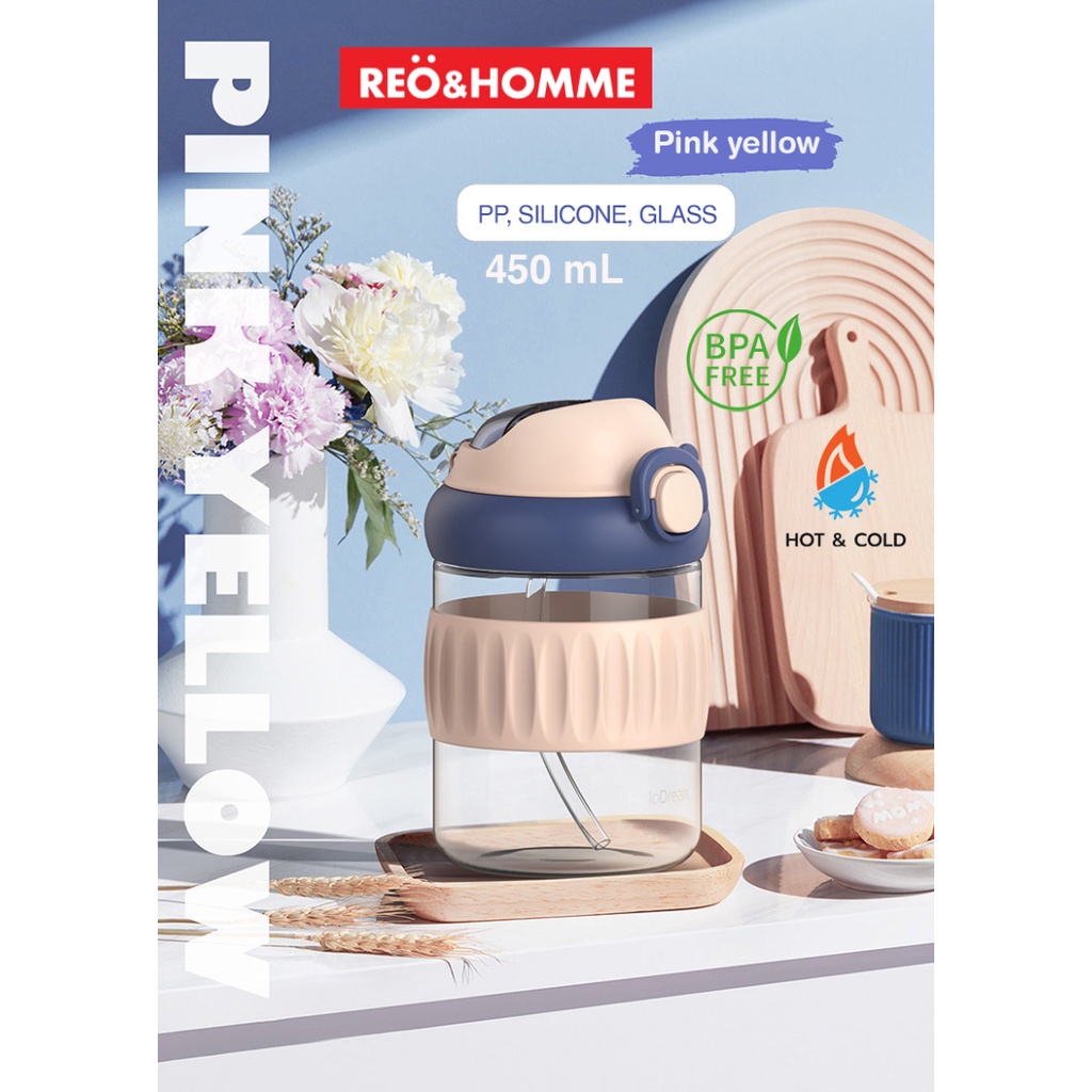Reo&Homme Botol Minum Kaca Dengan Sedotan & Silikon Mug Gelas Kopi 450 ML Borosilicate Glass Bottle Dual Drink with Silicone Grip H-6342