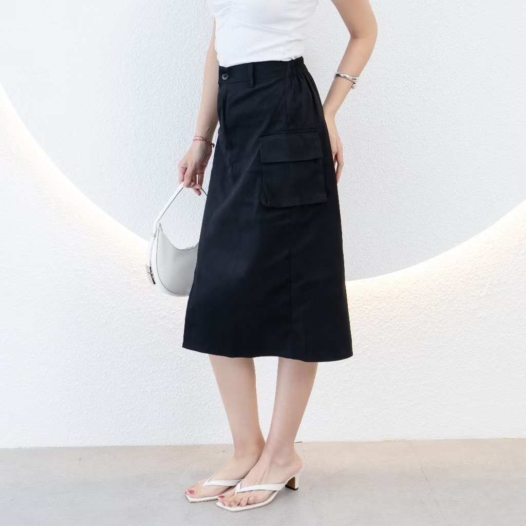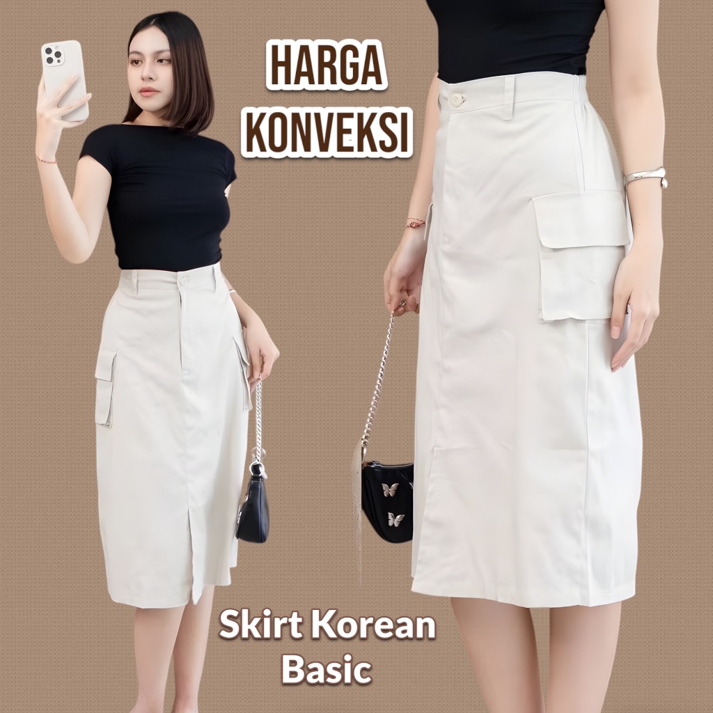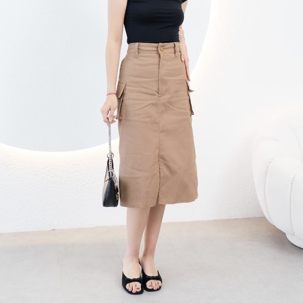 Rok Cargo Midi 7/8 A-Line Basic Katun Twill Tebal Hight Waist Karet Belakang Wanita Korean Flowly