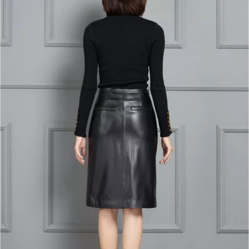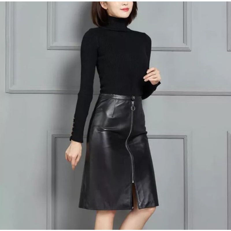 Rok Kulit Sintetis Leather Skirt PU Rok Midi Wanita Selutut Split Depan Full Resleting Model Rok Kerja Rok Wanita Kantoran