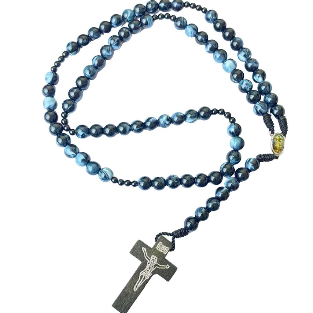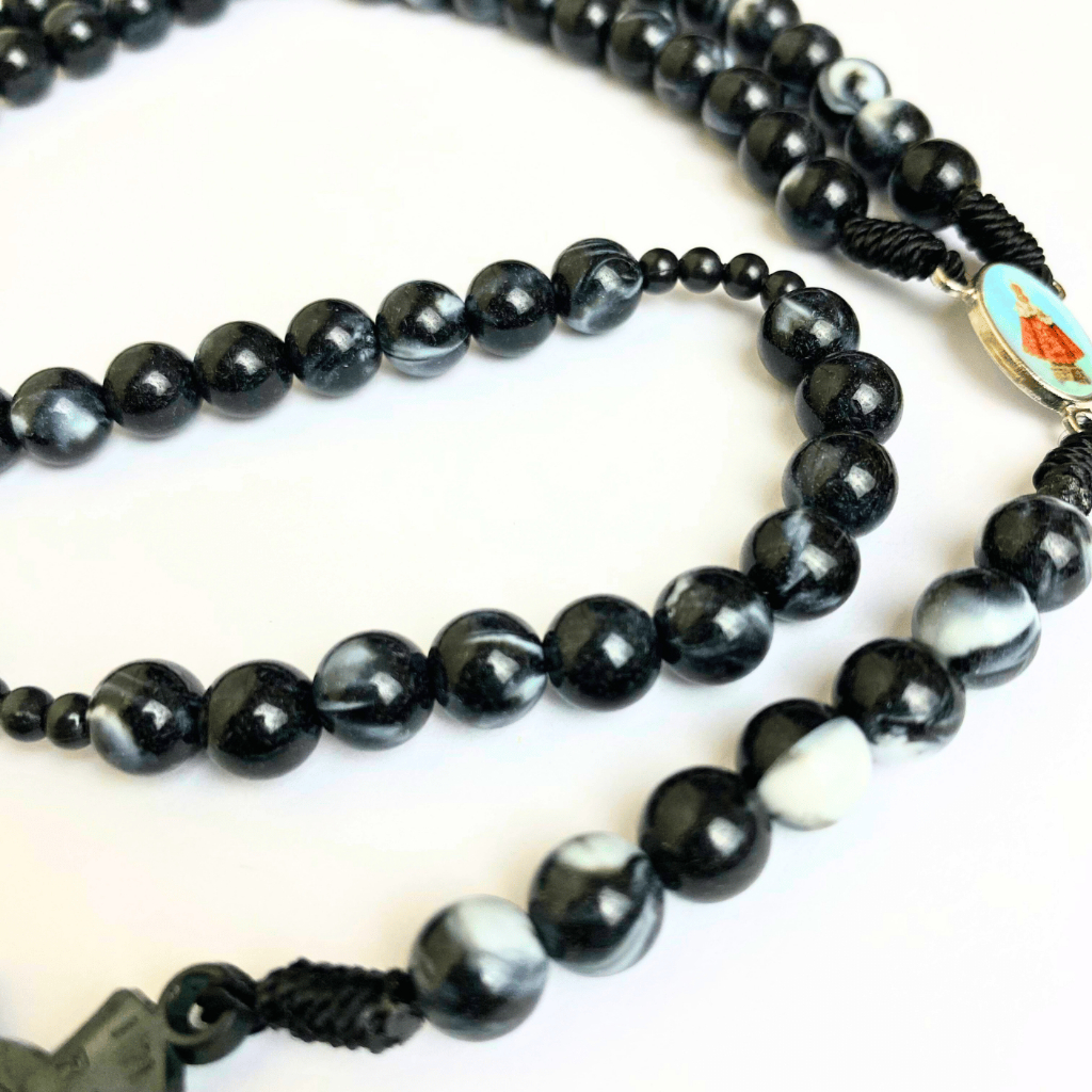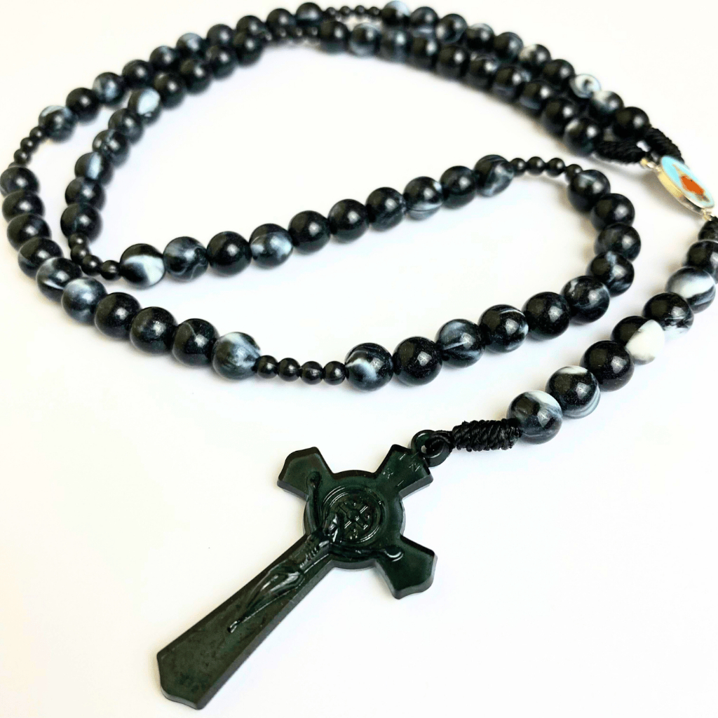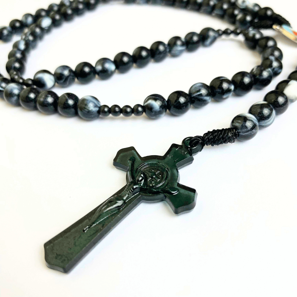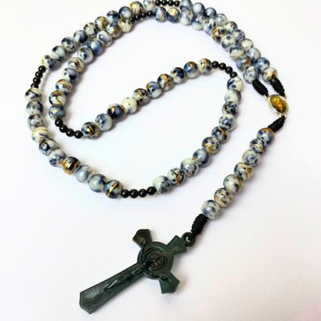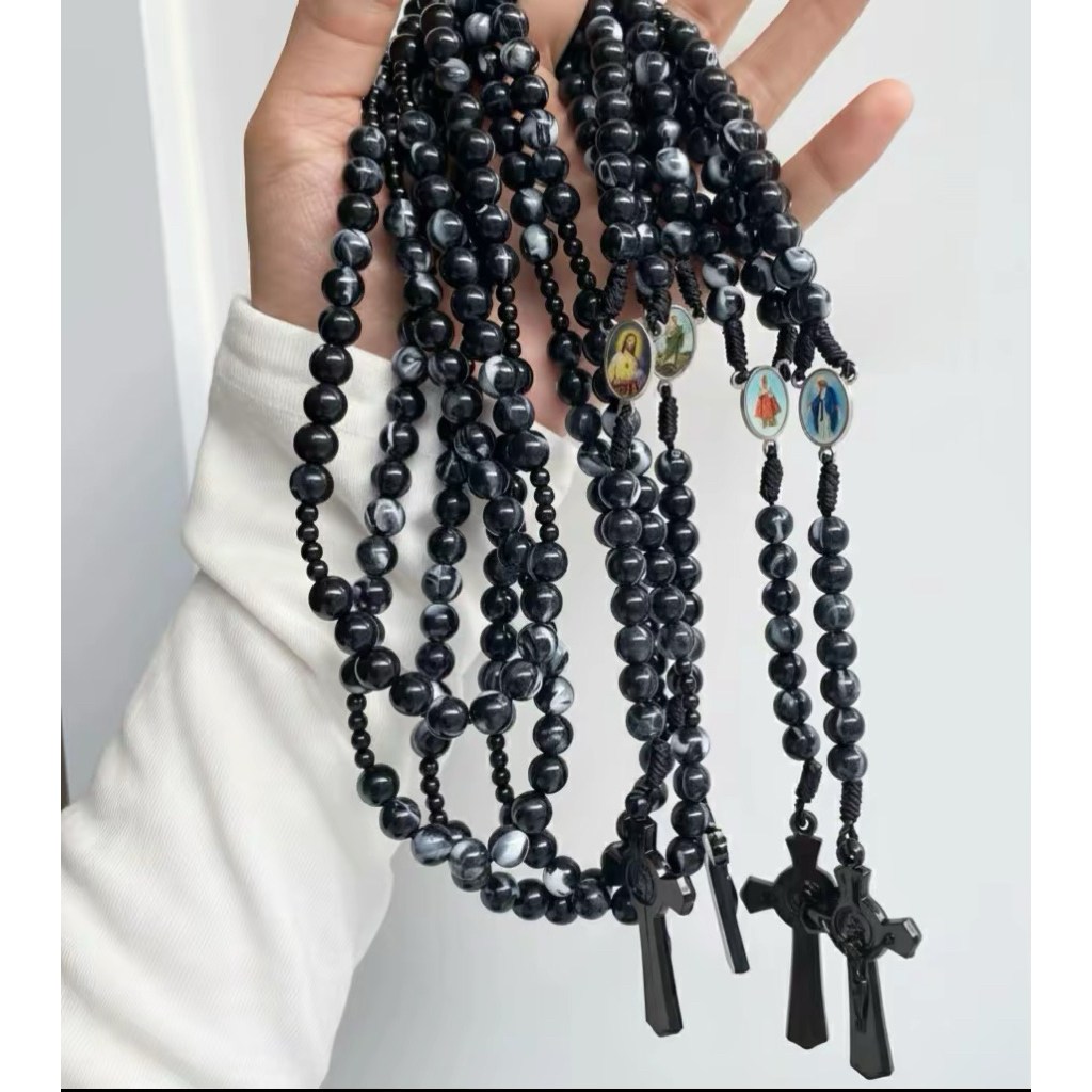 Rosario series hitam marmer bercorak eksklusif 77 bapa kami salib Benediktus santo perlindungan