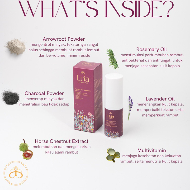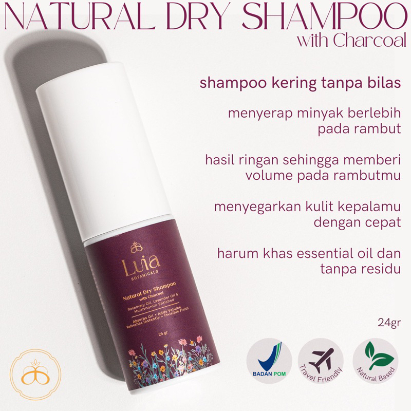 Luia Botanicals | Natural Dry Shampoo with Charcoal | BPOM | Shampoo Tanpa Bilas | Non Aerosol | Anti Lepek | Tapa Residu | Travel Size Ukuran 24 grn