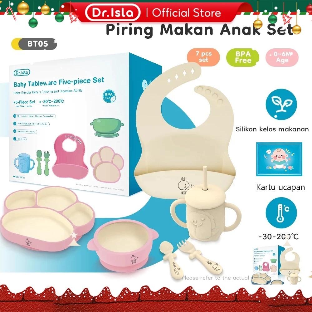 Dr.isla Piring Makan Anak Set 7Pcs Mangkuk Sendok Makan Bayi Celemek Makan Bayi Botol Minum Bayi Set Kotak Hadiah BT05