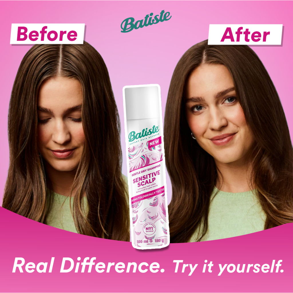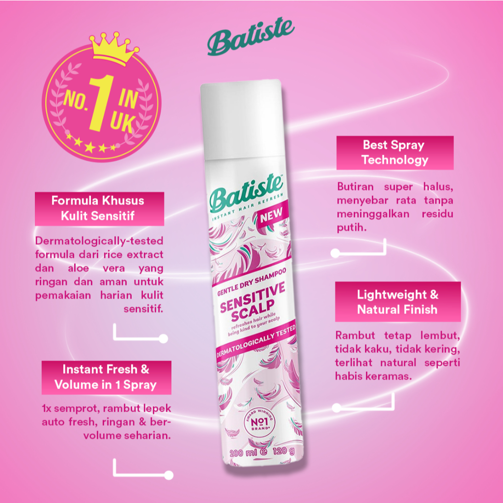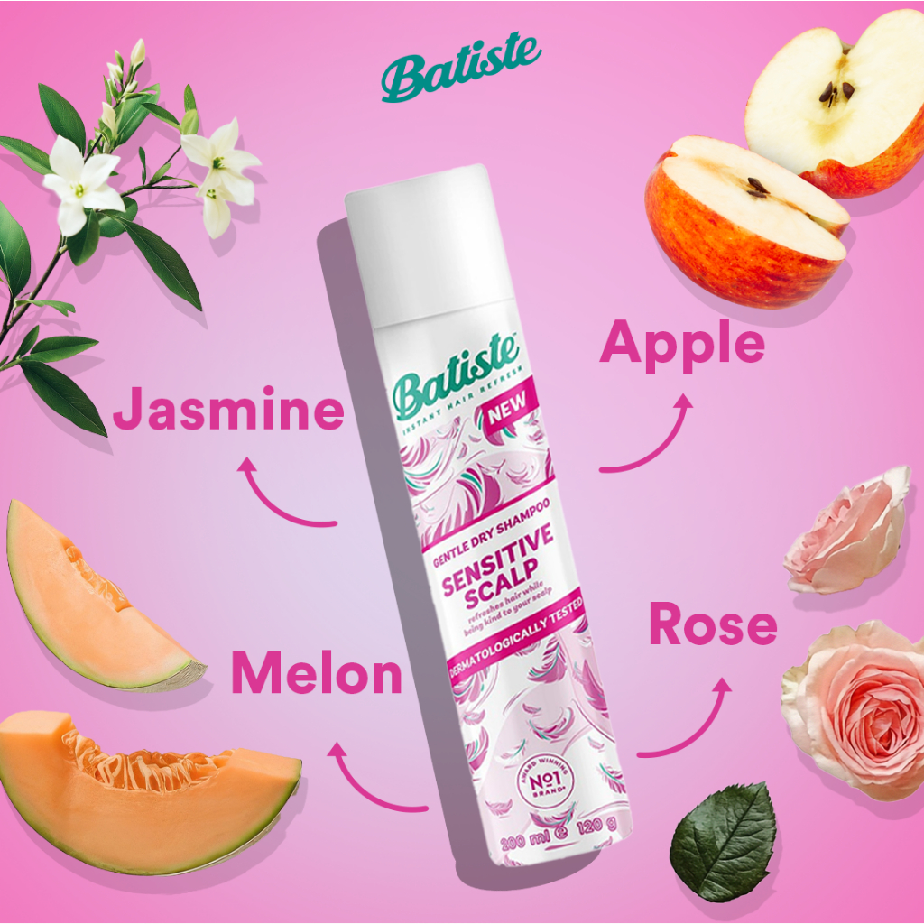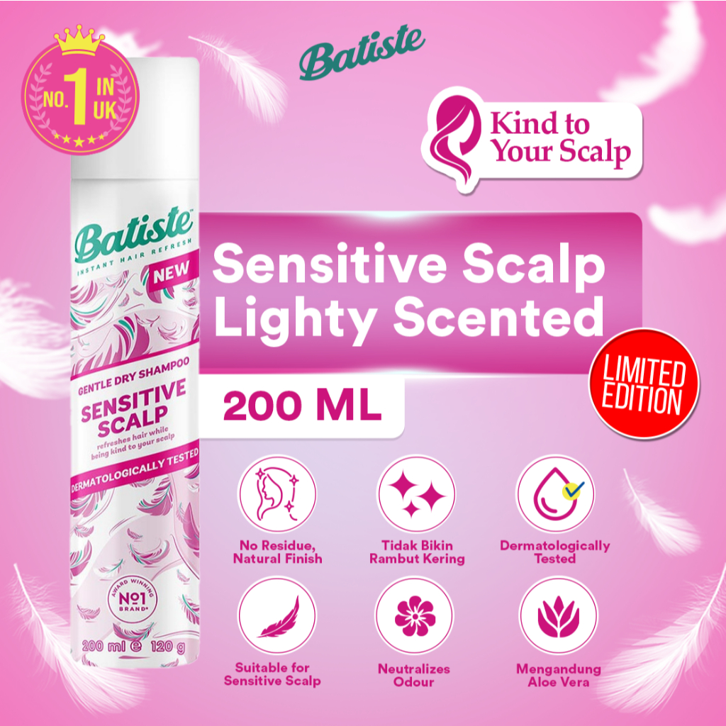 Batiste Sensitive Scalp Lightly Scented Dry Shampoo 200ml (Untuk Kulit Kepala Sensitive) FREE Sisir Kaca Lipat