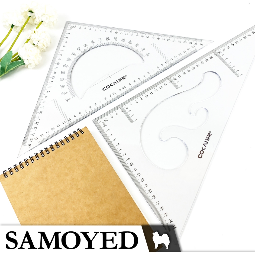 SAMOYED RLS-KJ-1240 Penggaris / Mistar Segitiga / Busur Derajat / Mal Pola Lengkung / Kurva / Wayang / Jahit Transparan / Bening / Transparent / Clear Triangle / Triangular Ruler / Protractor / French Curve Set 40 cm